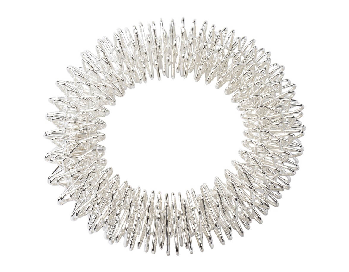 Un ajutor excelent din sârmă de oțel inoxidabil, modelată în triunghiuri. Glisând brăţara de la încheietura mâinii până sus pe braț, masaţi și stimulaţi punctele de presopunctură, datorită cărora se îmbunătăţeşte fluxul sanguin şi se relaxează nu doar mâinile, ci şi întregul corp.