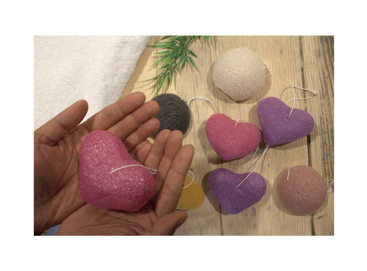 Buretele japonez konjac roz, realizat din fibre vegetale Amorphophallus Konjac, este folosit în mod tradițional pentru curățarea feței. Este atent cu toate tipurile de piele și datorită texturii sale fine și moi, este potrivit și pentru pielea sensibilă. Buretele este modelat în formă de inimă, iar datorită dimensiunilor sale se potrivește perfect în palmă. Sfoara subțire asigură o prindere sigură în timpul utilizării și datorită acesteia, buretele poate fi atârnat și lăsat să se usuce.