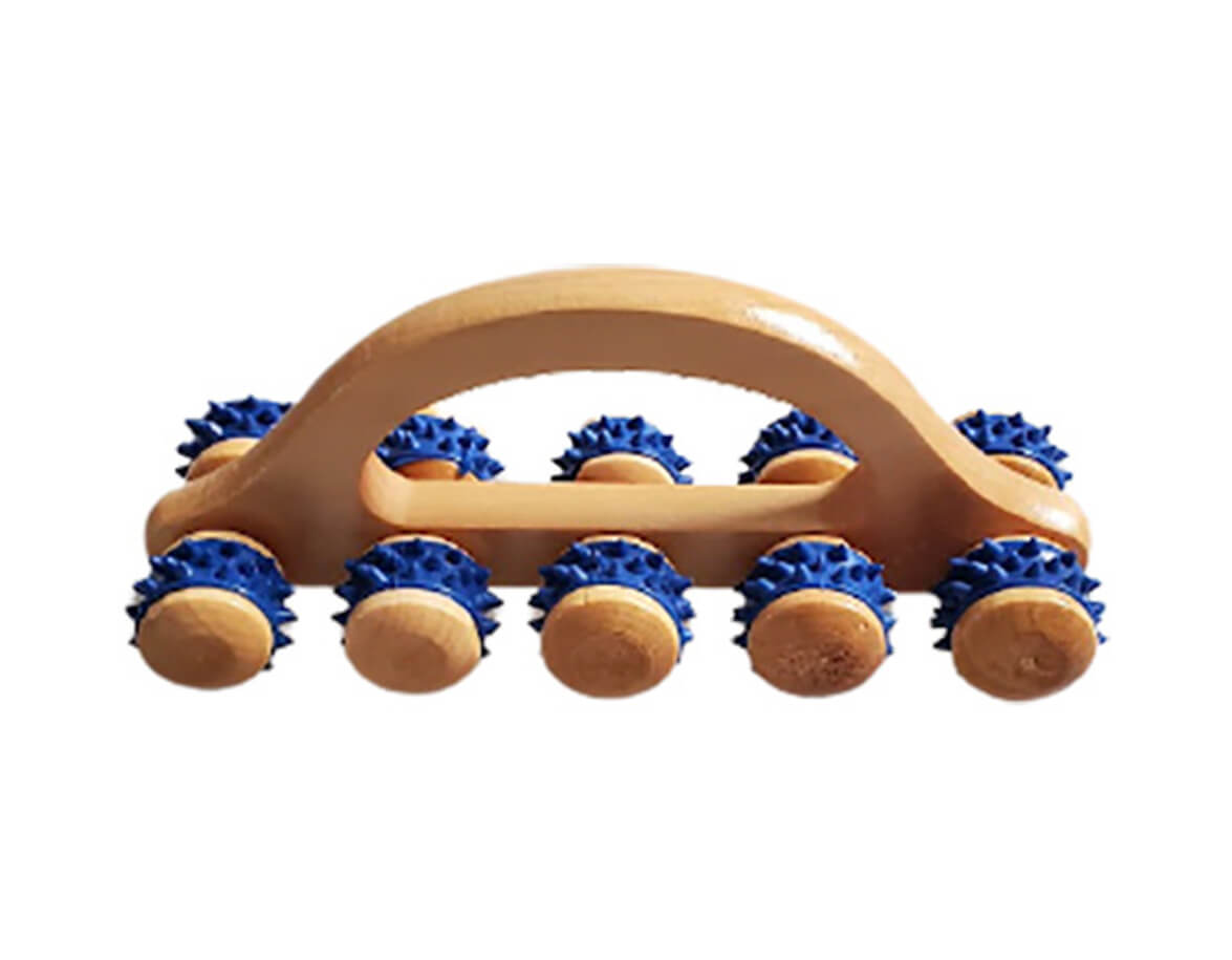 Accesoriu din lemn pentru masaj, cu mâner, pentru o prindere și manipulare mai ușoară. Proeminențele din cauciuc de pe rotițe, copiază forma corpului în timpul masajului, exercitând presiune asupra punctelor active, ceea ce duce la îmbunătățirea circulației sângelui în zona părților masate.