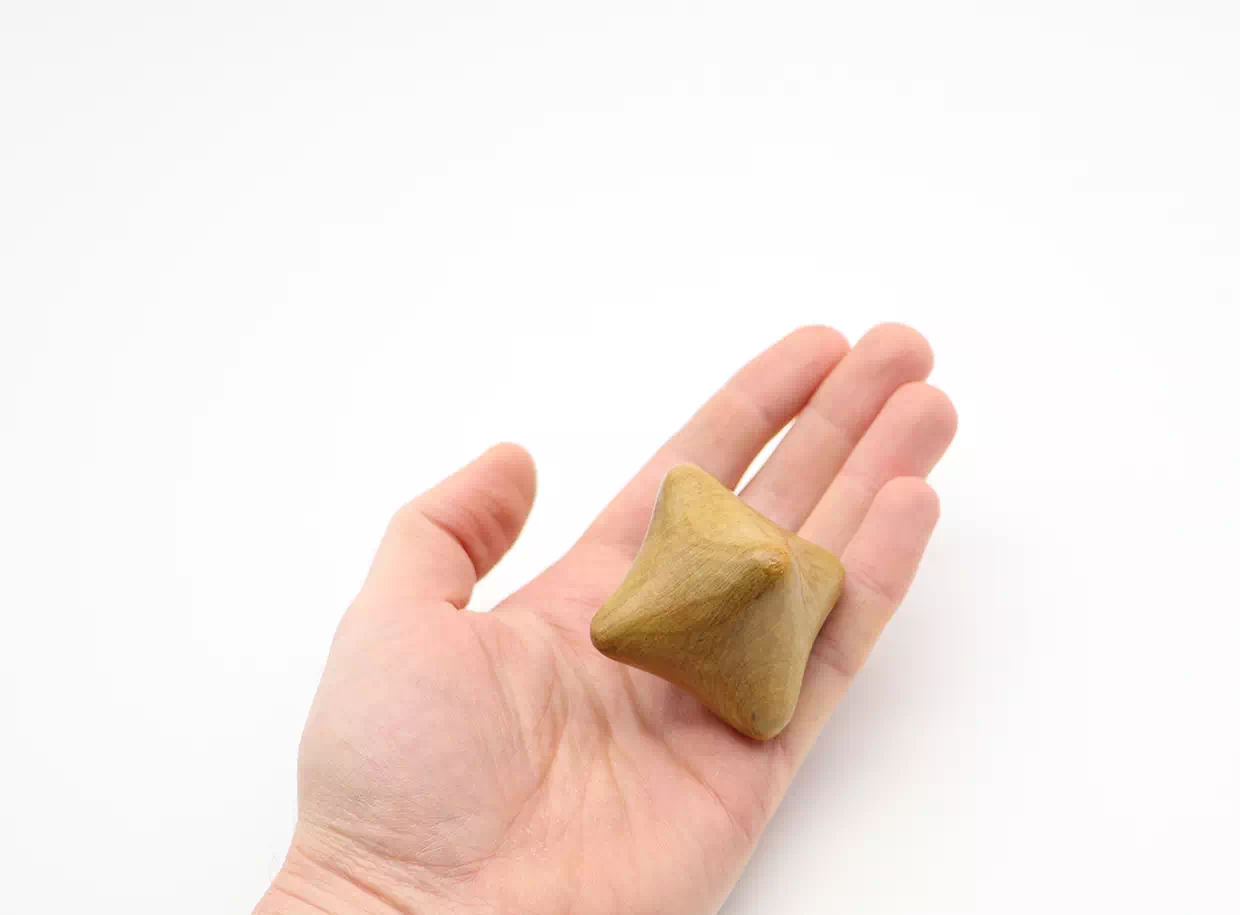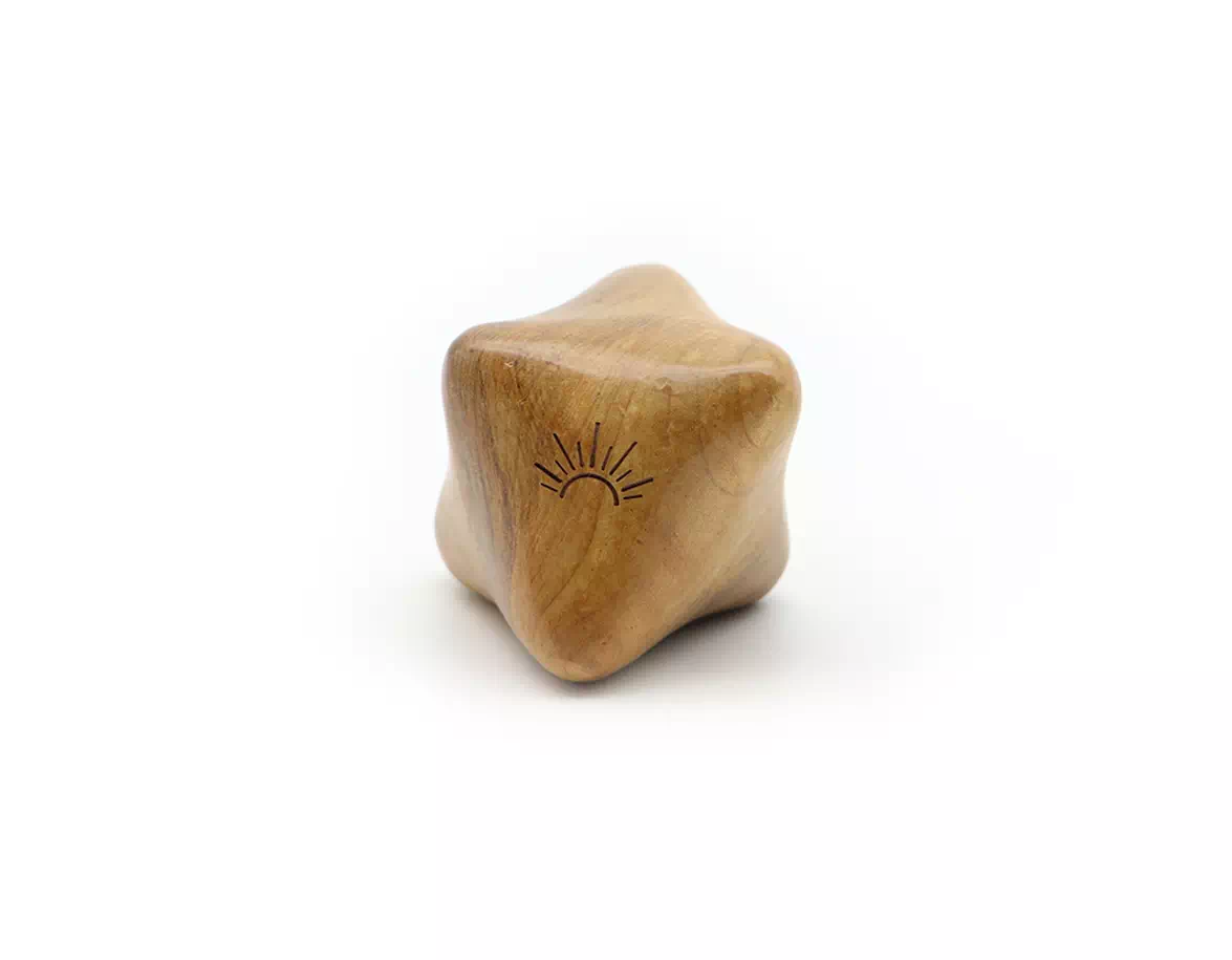 Cubul de masaj din lemn de santal are 6 proeminențe fin lustruite potrivite pentru tratarea trigger points. Forma specială îi permite maseurului să apese pe mai multe puncte de declanșare simultan și să elibereze eficient tensiunea din mușchi, fără a-și suprasolicita degetele, sau degetele mari.
