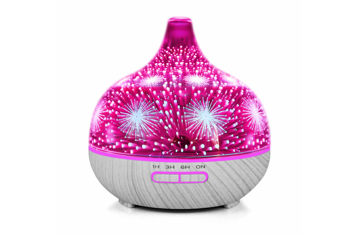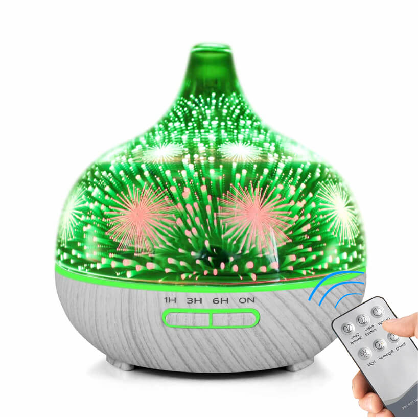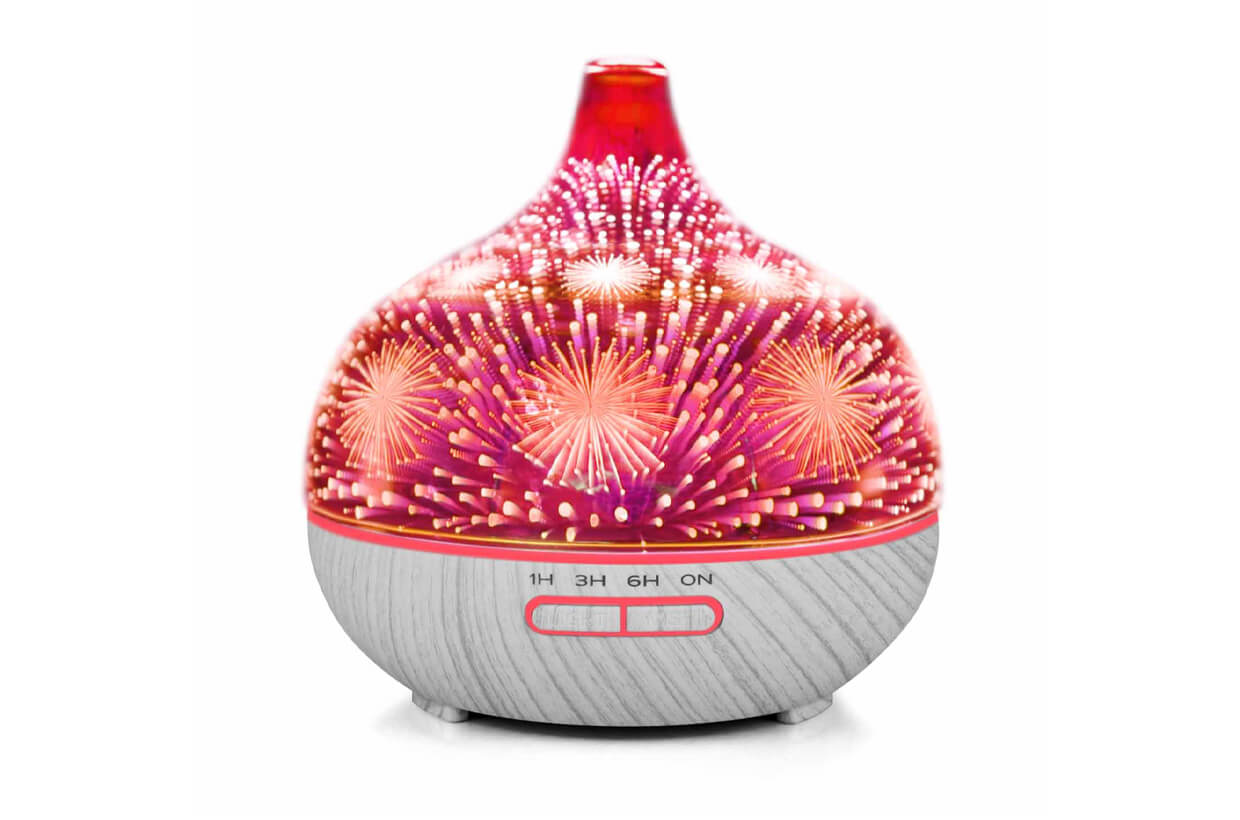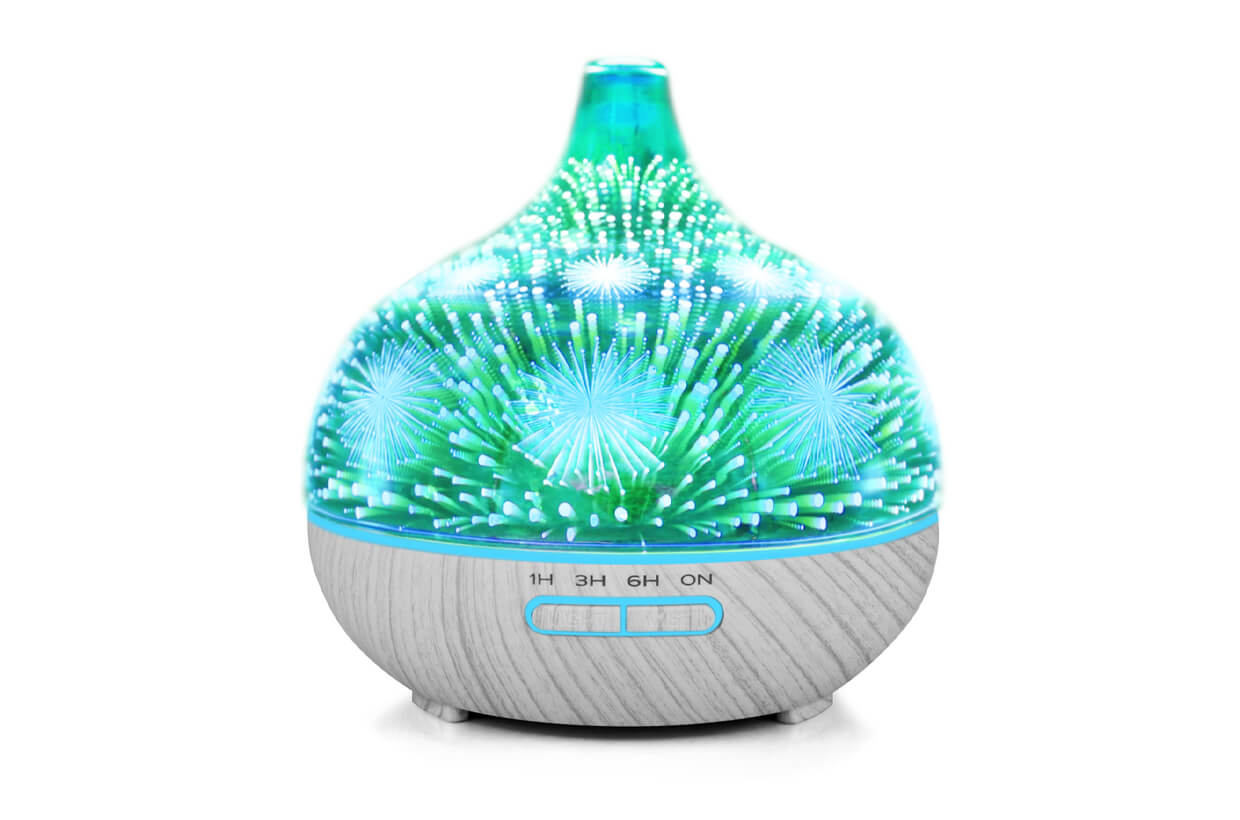 Umidificator cu ultrasunete. Un accesoriu pentru interior elegant şi silenţios, care ocupă puţin spaţiu, cu capac de sticlă şi led cu efect 3D şi suport în culoarea lemnului alb.