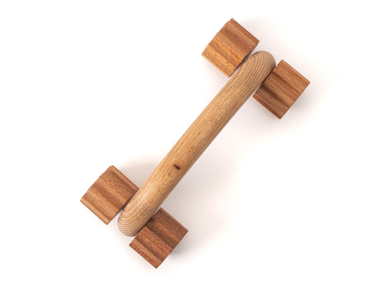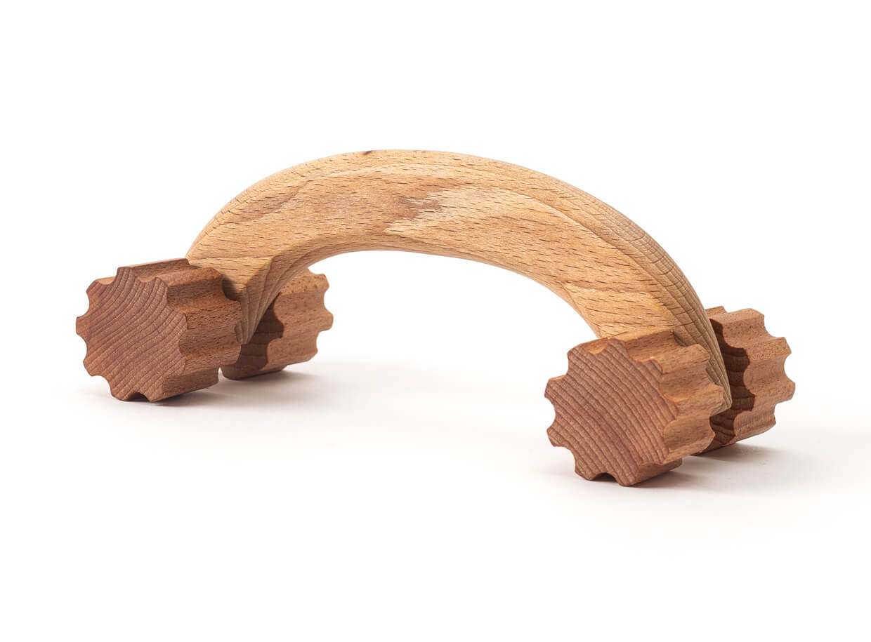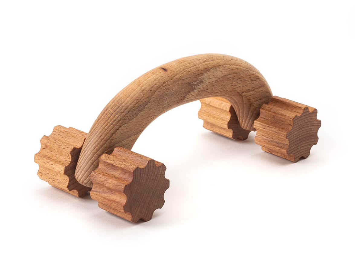 Este realizat din lemn masiv de fag de calitate superioară, care are o durată lungă de viață. Dispozitivul de masaj are un mâner ergonomic și 4 role de masaj, care masează temeinic mușchii obosiți și încordați. În timpul unui masaj mai intensiv, rolele pătrund adânc în țesut și oferă o destindere mai semnificativă a mușchilor.