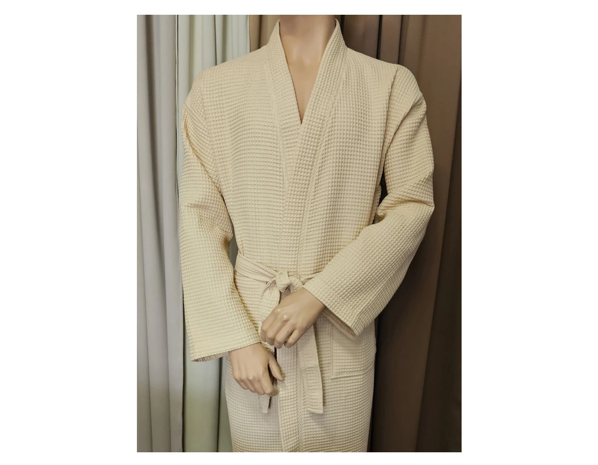 Halat de baie unisex, din bumbac, de culoare bej, cu o croială de kimono lejeră și confortabilă. Partea din față a halatului de baie este completată de două buzunare și se fixează cu cordon.