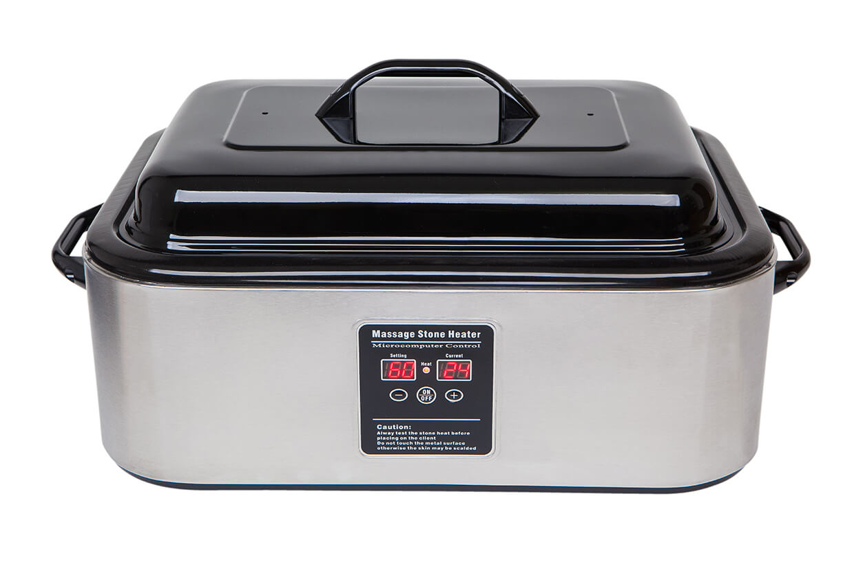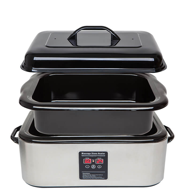 Încălzitor profesional pentru pietrele de lavă cu control digital al temperaturii. Corpul dispozitivului este echipat cu un cablu de alimentare, afişaj digital şi mânere rezistente la căldură. Recipientul intern detaşabil este lavabil. Pe partea de jos a acestuia se pune un prosop alb pliat, pe care se întind pietrele de lavă şi completăm cu apă, astfel încât pietrele să fie scufundate, dar cel mult până la linia marcată maxim pe partea laterală a recipientului. Setul include şi un capac.