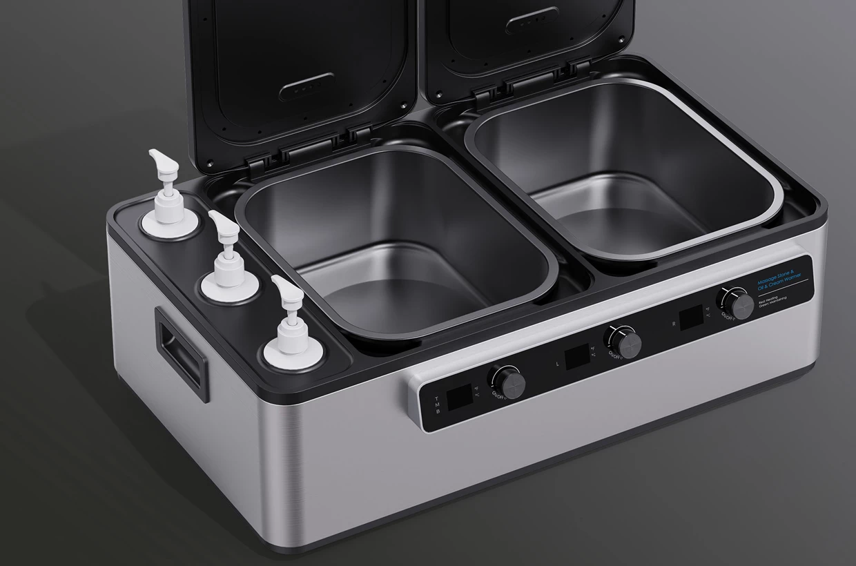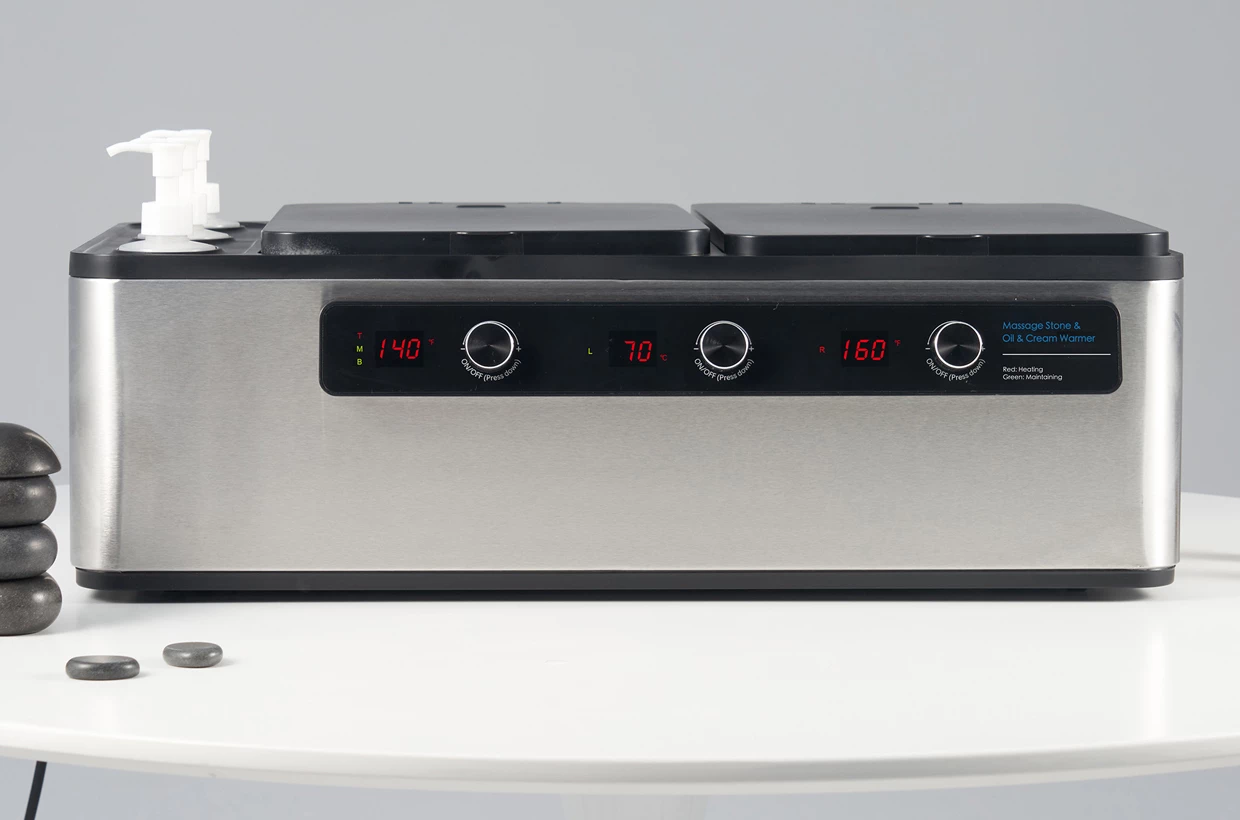 Un dispozitiv multifuncțional, care permite încălzirea rapidă a 2 seturi de pietre vulcanice concomitent și până la 3 tipuri diferite de ulei de masaj, cu setare independentă a temperaturii de încălzire în °C sau °F, pentru ambele tăvițe destinate pietrelor vulcanice și pentru încălzitorul de uleiuri.