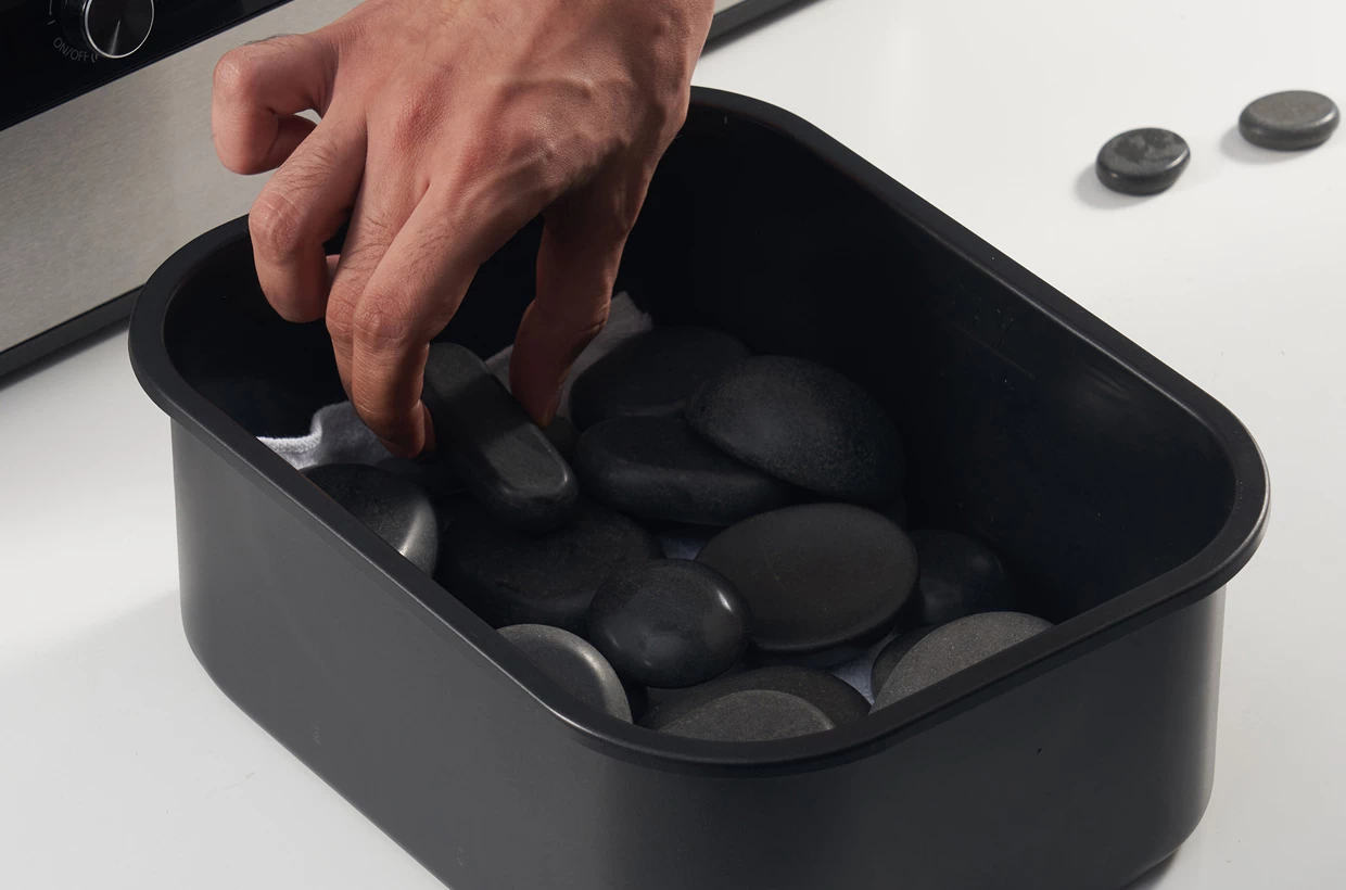 În tava de încălzire a pietrelor vulcanice, puteți încălzi și săculeți cu gel, sau turbă, de dimensiunea corespunzătoare, astfel încât acștia să nu atingă pereții tăvii și să fie scufundați în apă