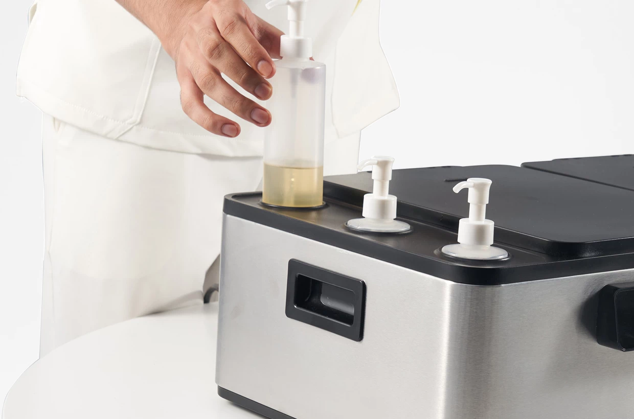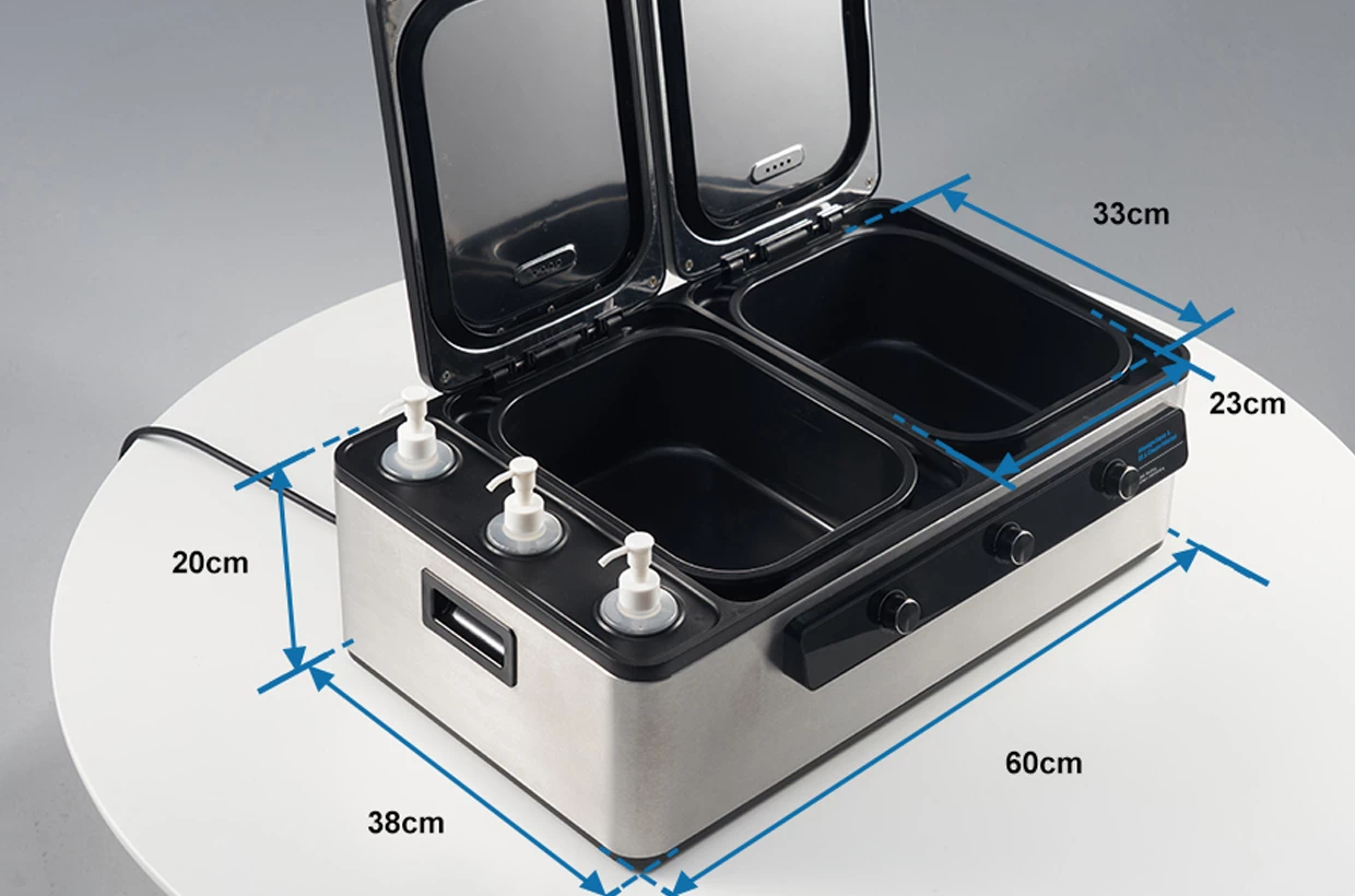 Încălzire independentă pentru toate cele 3 recipiente de ulei de masaj, în intervalul 40 - 60°C. Dispozitivul include trei recipiente de ulei, a câte 300 de ml fiecare, cu dozator. Cantitatea recomandată de ulei de masaj pentru o încălzire optimă este de 200 ml într-un recipient.