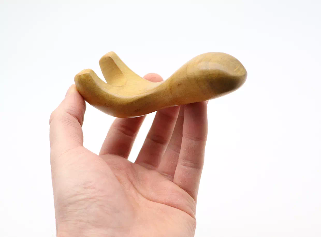 Datorită formei ergonomice este ușor de ținut în mână, iar proeminențele din lemn lustruit, alunecă plăcut pe piele. Instrumentul de masaj este potrivit pentru masajul diferitelor părți ale corpului în saloane profesionale, dar și pentru utilizarea în confortul casei.
