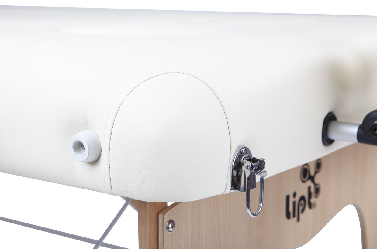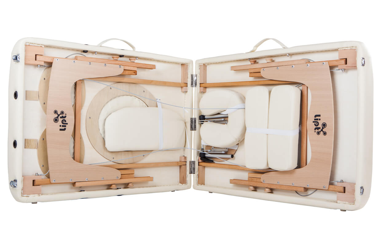 Desfacerea și plierea patului este foarte ușoară și cu puțină practică nu îi ia maseurului nici jumătate de minut. Datorită acestui fapt, patul de masaj pentru gravide Lipt DT-03 poate fi folosit ca masă mobilă de masaj. Prețul mesei de masaj include alte accesorii: geantă, tetieră, suport pentru tetieră, cotieră și cotiere laterale. Toate accesoriile sunt detașabile și pot fi depozitate în spațiul din interiorul patului de masaj. Pentru un transport sigur și confortabil, patul și accesoriile sale pot fi pliate cu ușurință și rapiditate într-o geantă practică de transport, din material textil solid, care protejează în mod fiabil tapițeria din imitație de piele, de daune mecanice și murdărie și vă permite să aveți toate echipamentele laolaltă.