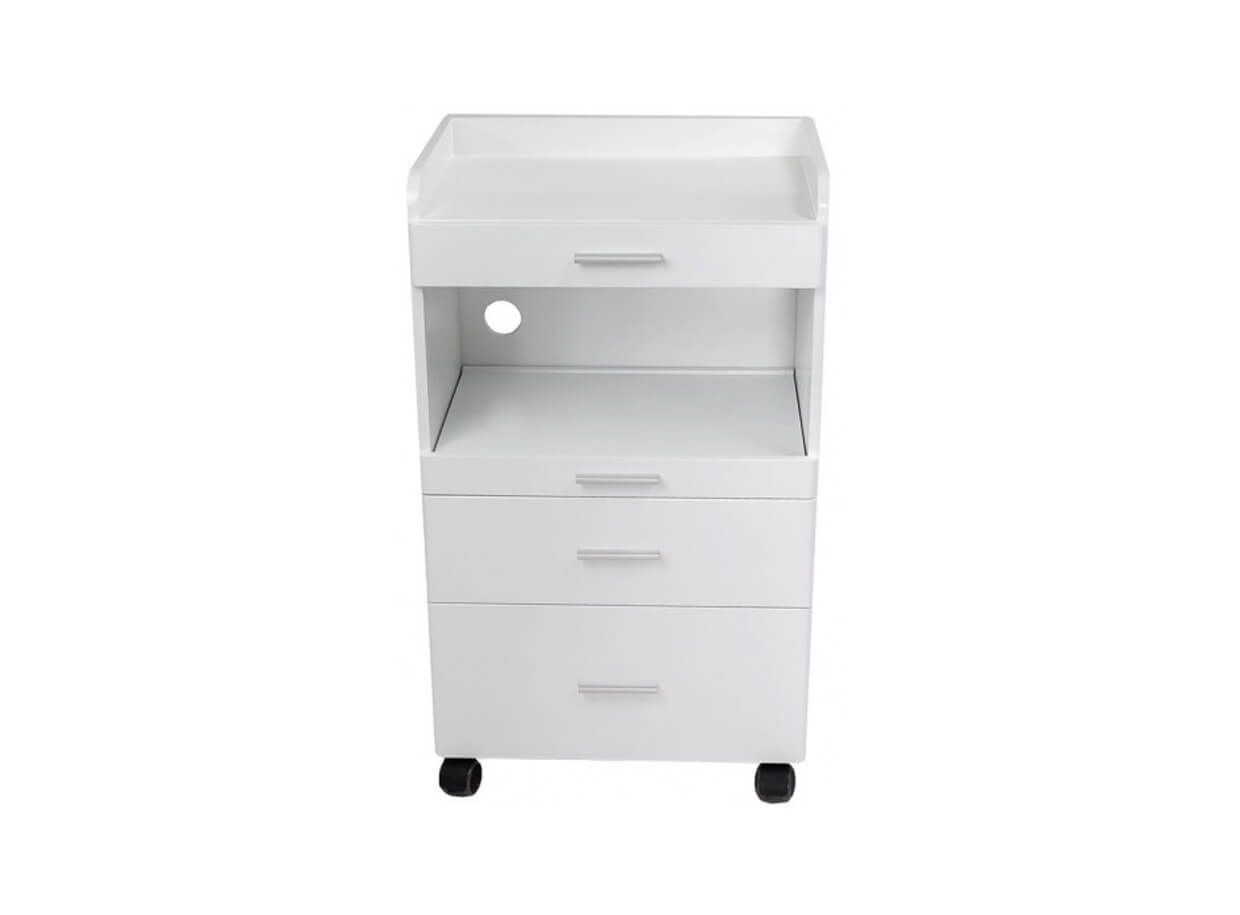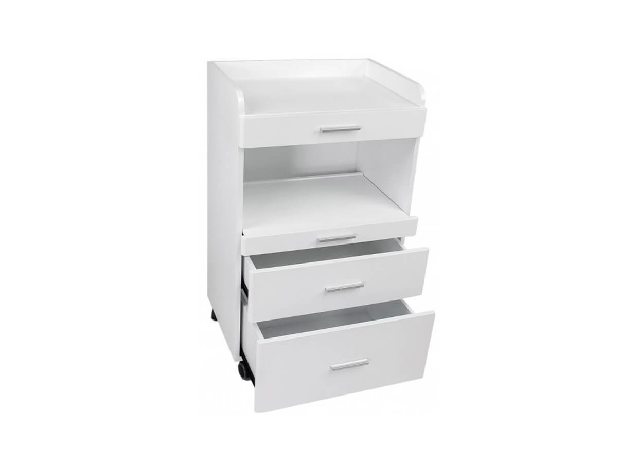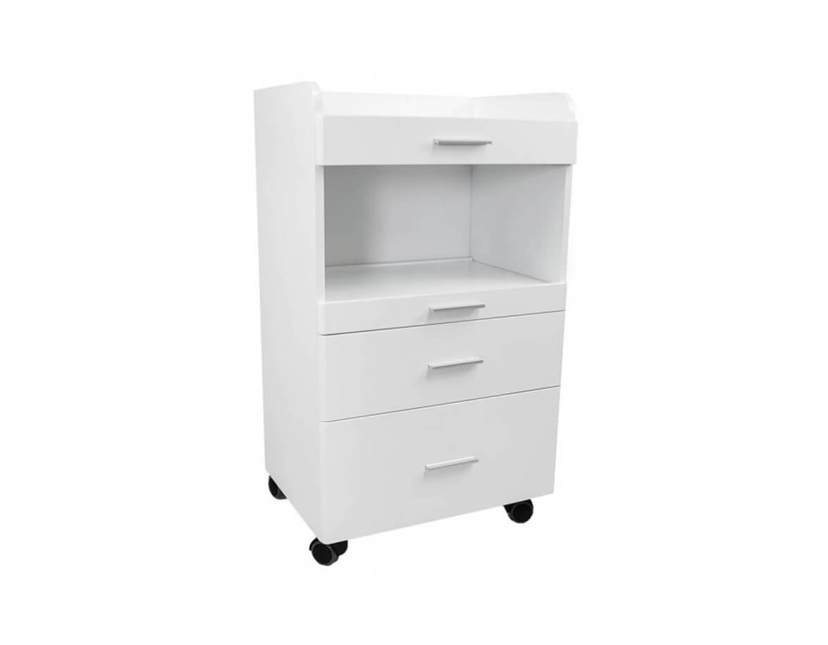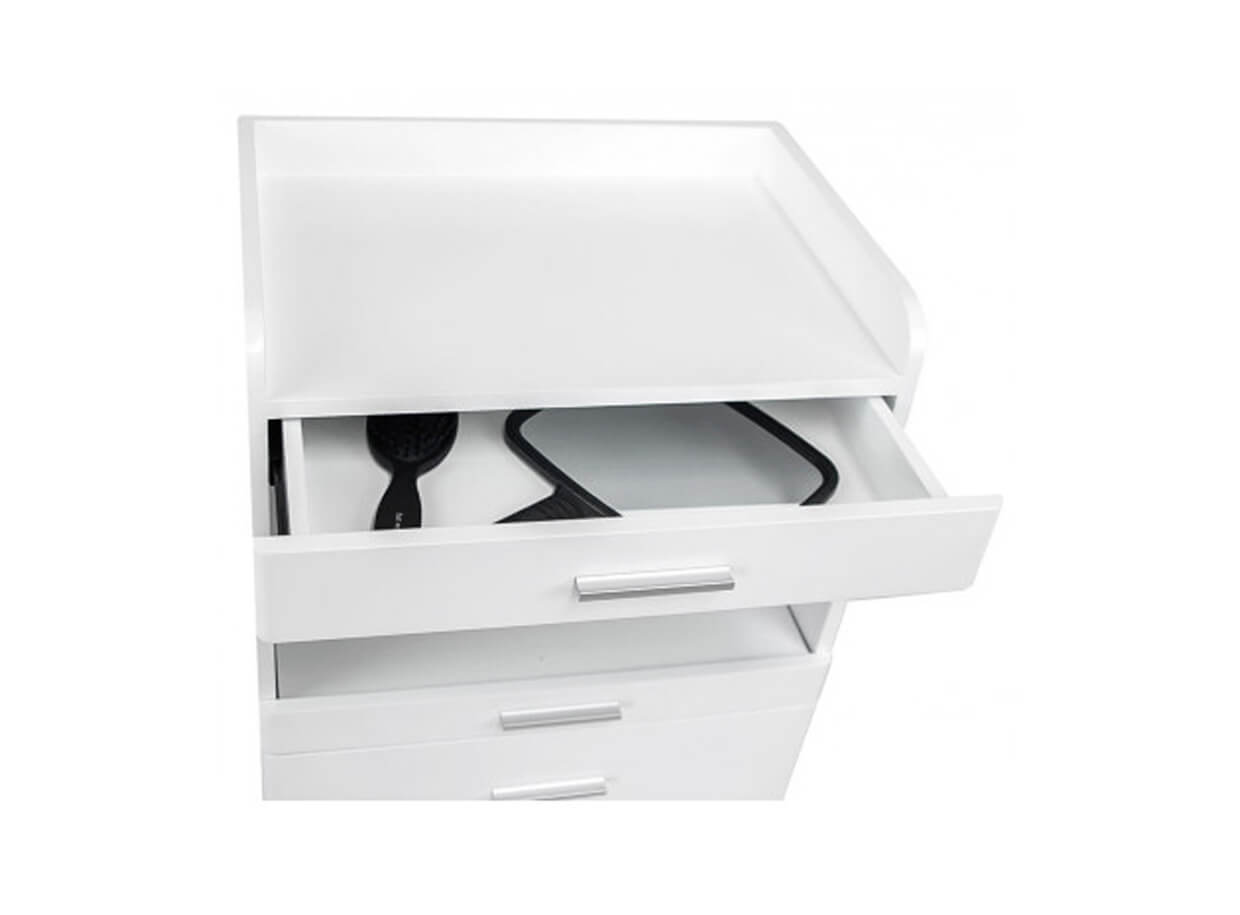 Măsuță cosmetică funcțională FANCY, din PAL alb lăcuit, dotată cu roți pentru o deplasare ușoară. Dispune de spațiu de depozitare cu trei sertare de dimensiuni diferite pentru depozitarea accesoriilor de lucru .
