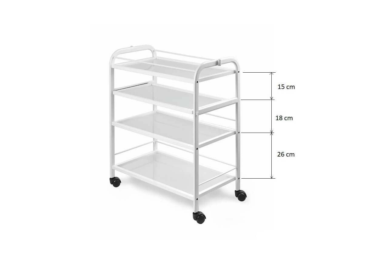 Măsuță pe roți, cu 4 rafturi din sticlă securizată cu dimensiunea cca 74 x 44 cm, care oferă suficient spațiu pentru tot ceea ce este nevoie să aveți la îndemână. Al doilea raft de sus, este mobil. Distanța dintre rafturi (începând de jos) este de 26, 18 și 15 cm. Înălțimea întregii măsuțe este de 91 cm.