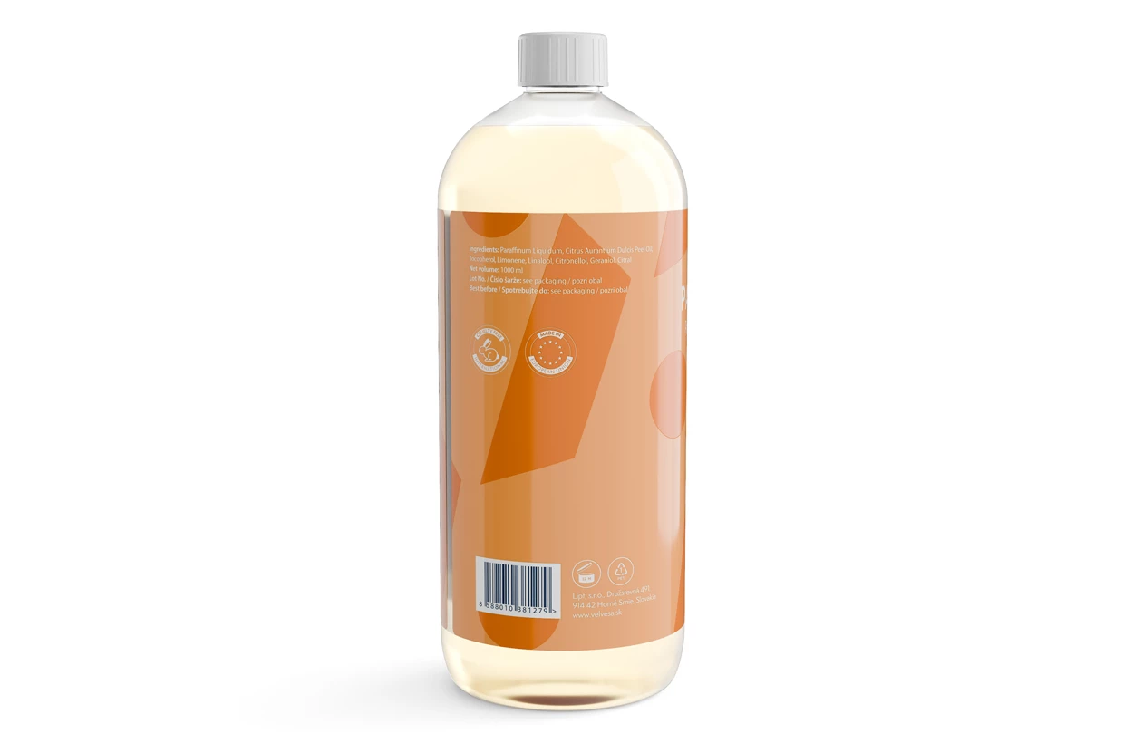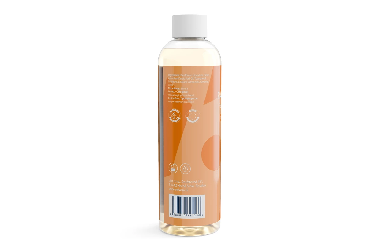 Compoziție (INCI): Paraffinum Liquidum (ulei de parafină), Citrus Aurantium Dulcis Peel Oil (ulei de coajă de portocală dulce), Tocoferol (vitamina E naturală), Limonene*, Linalool*, Citronelol*, Geraniol*, Citral*, *componentă naturală a uleiurilor esențiale