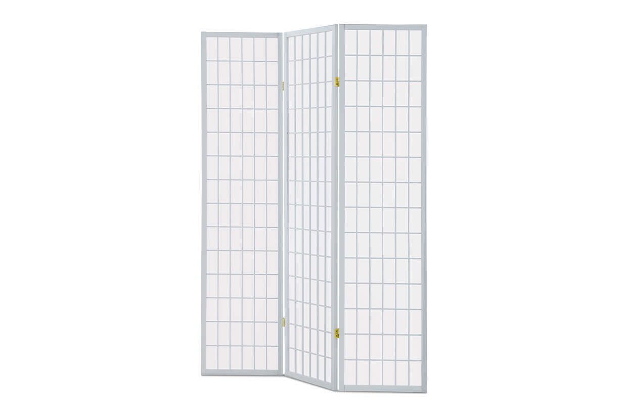 Paravan modern din trei elemente, cu o structură din lemn realizată din molid solid într-o culoare alb.