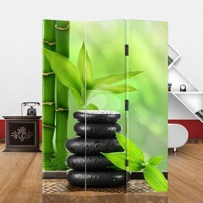 Paravan din 3 piese Bambus şi pietre cu imprimeu foto pe ambele părţi.