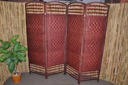 Paravan cu dimensiuni mai mari, cadru de lemn, cu împletituri din sfori din iarbă de mare, într-o nuanță roșu-maro.