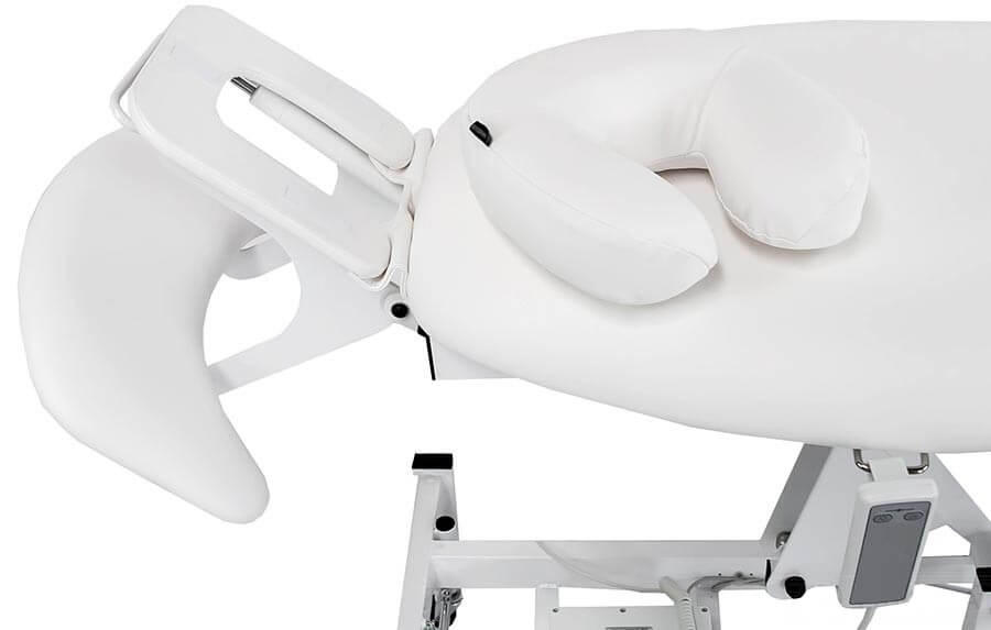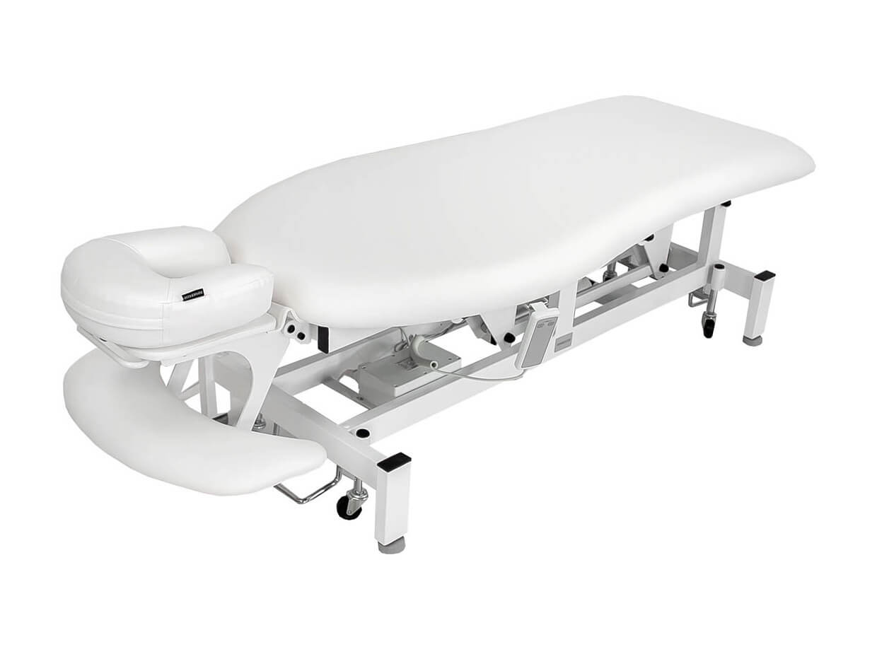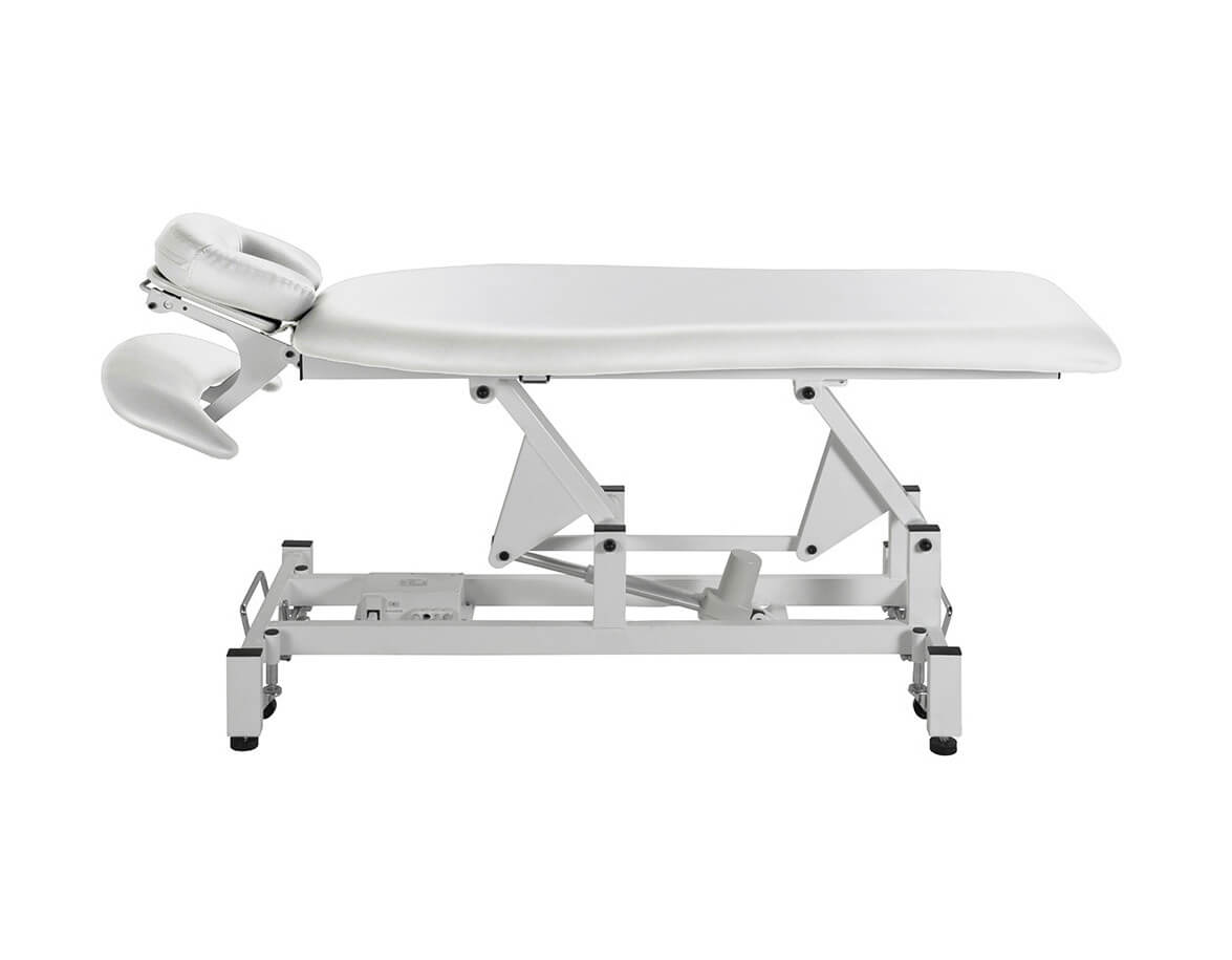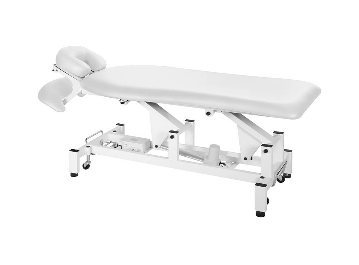Pat de masaj, dintr-o singură bucată, cu tetieră, echipat cu motor pentru controlul înălțimii de la 53 la 83 cm, cu acționare manuală.
