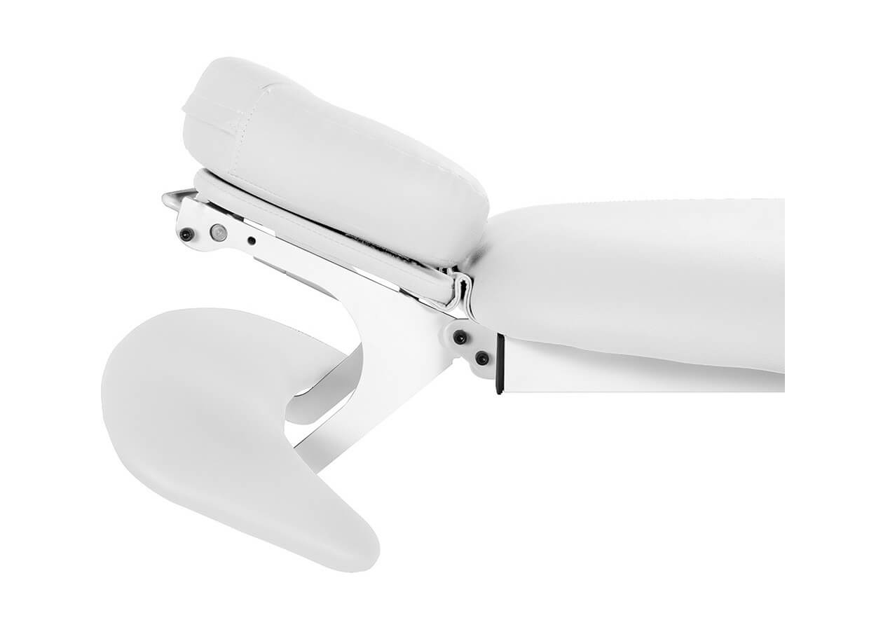 Tetiera confortabil tapițată cu decupaj pentru față este conectată la suportul pentru brațe și cotieră. Astfel, la reglarea înclinației tetierei, înclinația cotierei este, de asemenea, reglată în același timp.Posibiliatea de reglare a tetierei, a suportului pentru brațe și a cotierelor este de 25° în jos și 30° în sus și este controlată de o manetă pneumatică.