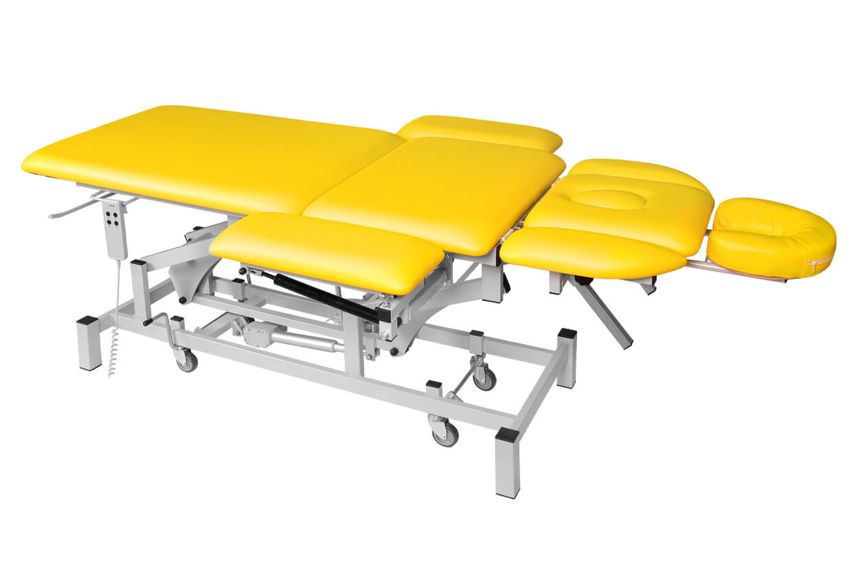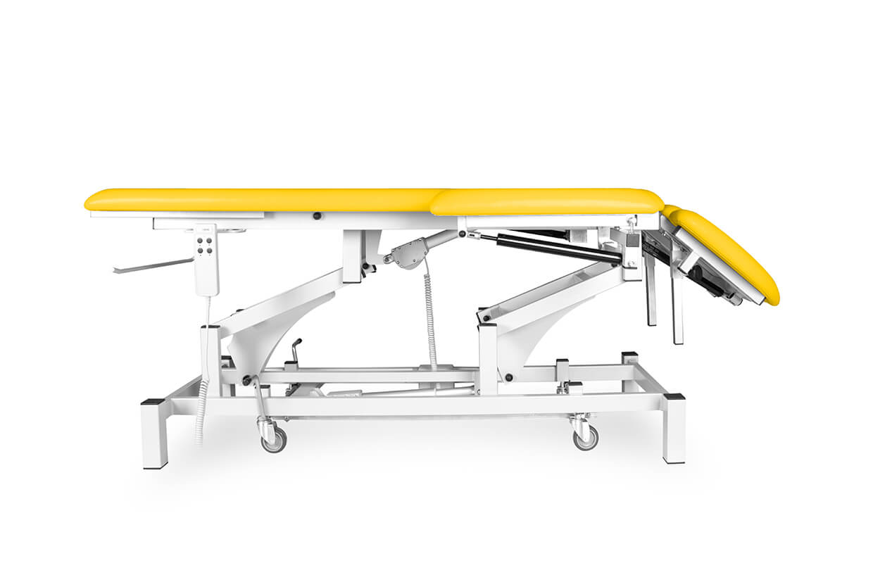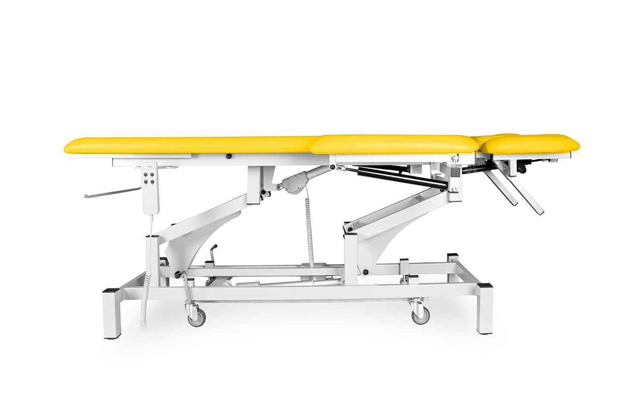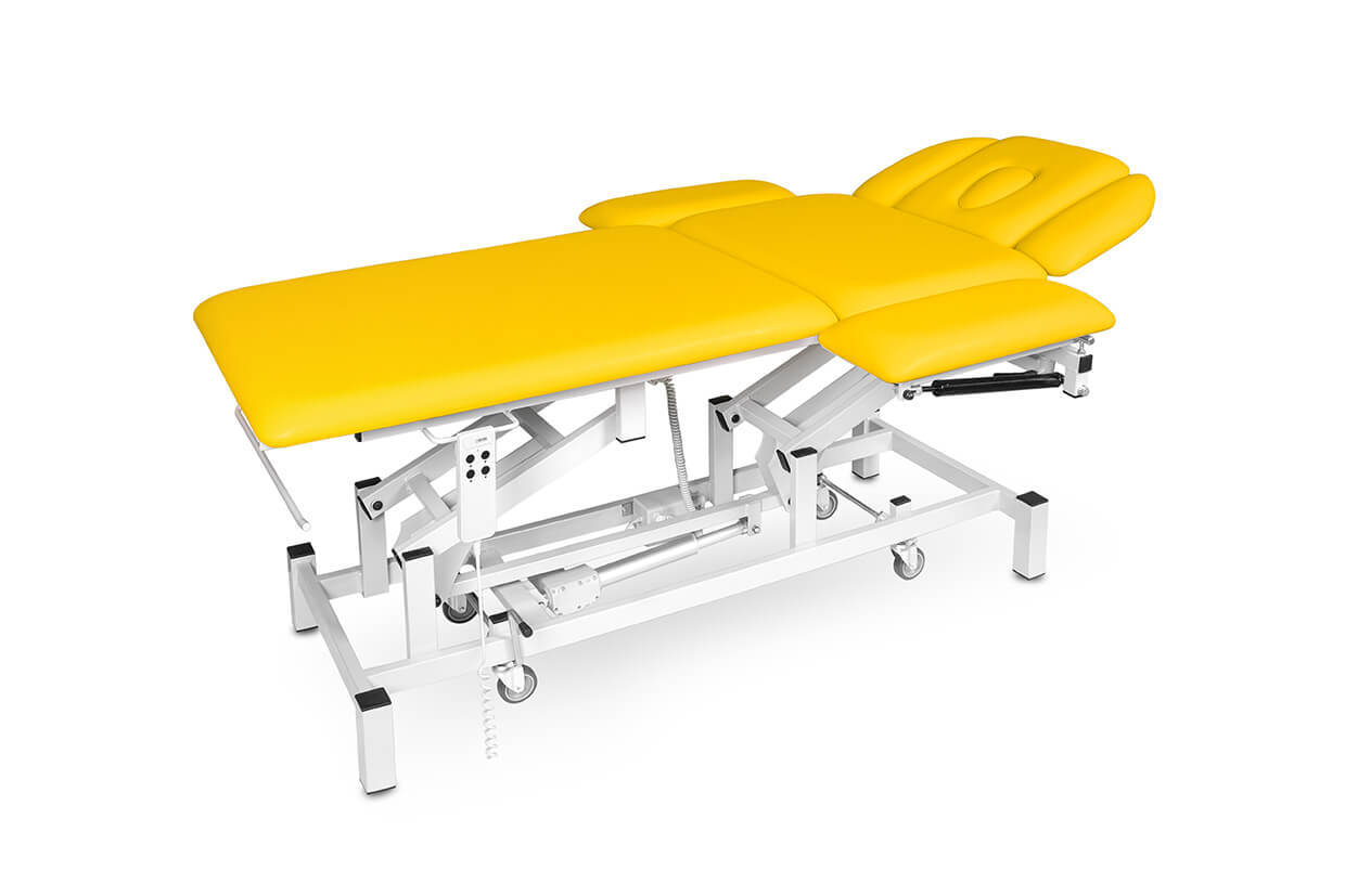 Pat profesional electric, reglabil, din trei elemente, cu un motor fiabil și silențios, potrivit pentru maseuri și fizioterapeuți cu o capacitate de încărcare de până la 200 kg și cu posibilitate de ridicare mai amplă. Patul este tapițat confortabil cu spumă de 4 cm grosime și imitație de piele de înaltă calitate, ușor de curățat și echipat cu piciorușe antiderapante reglabile. Partea superioară și cea inferioară (ridicare în V) ale patului pot fi pozițione cu ajutorul picioarelor telescopice. În prețul patului este inclusă și telecomanda.