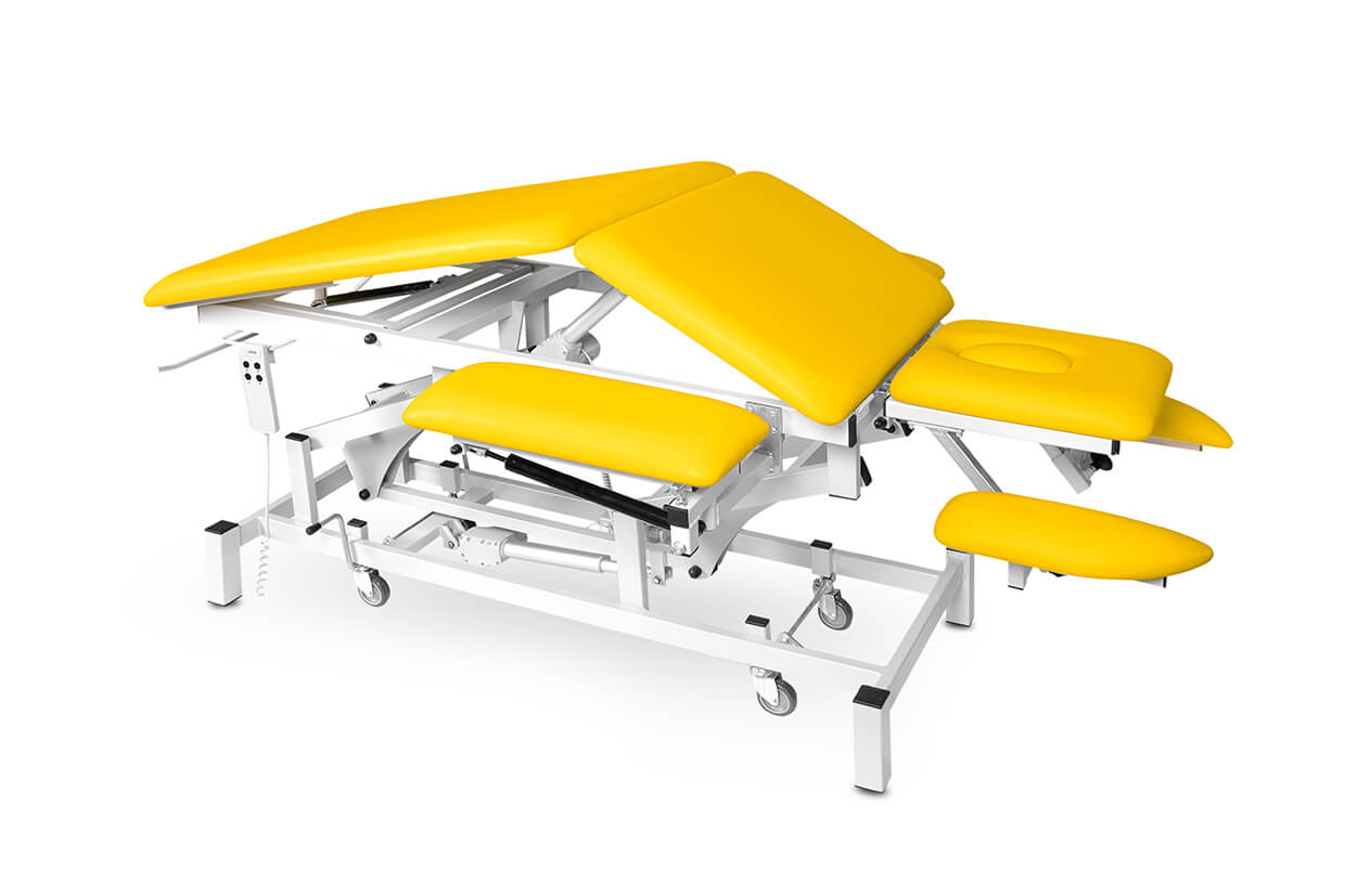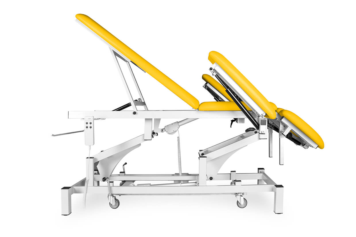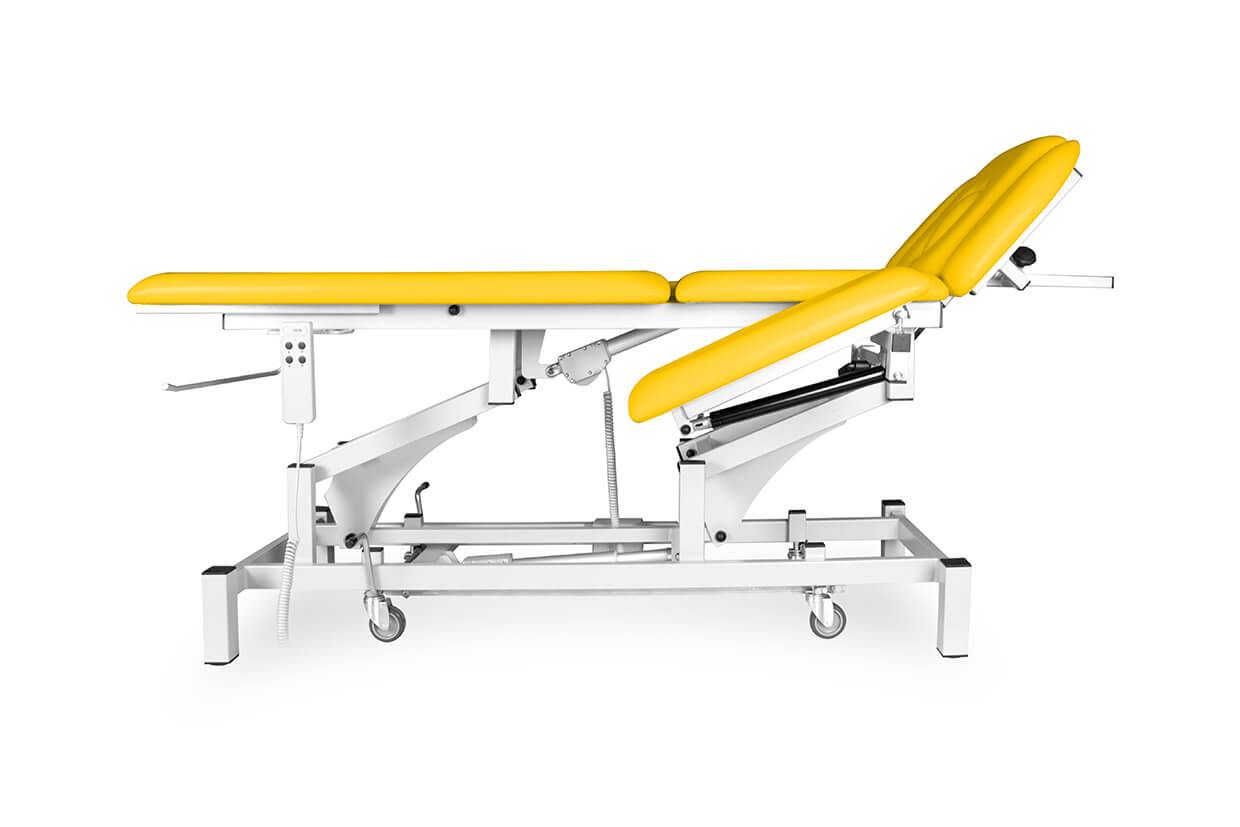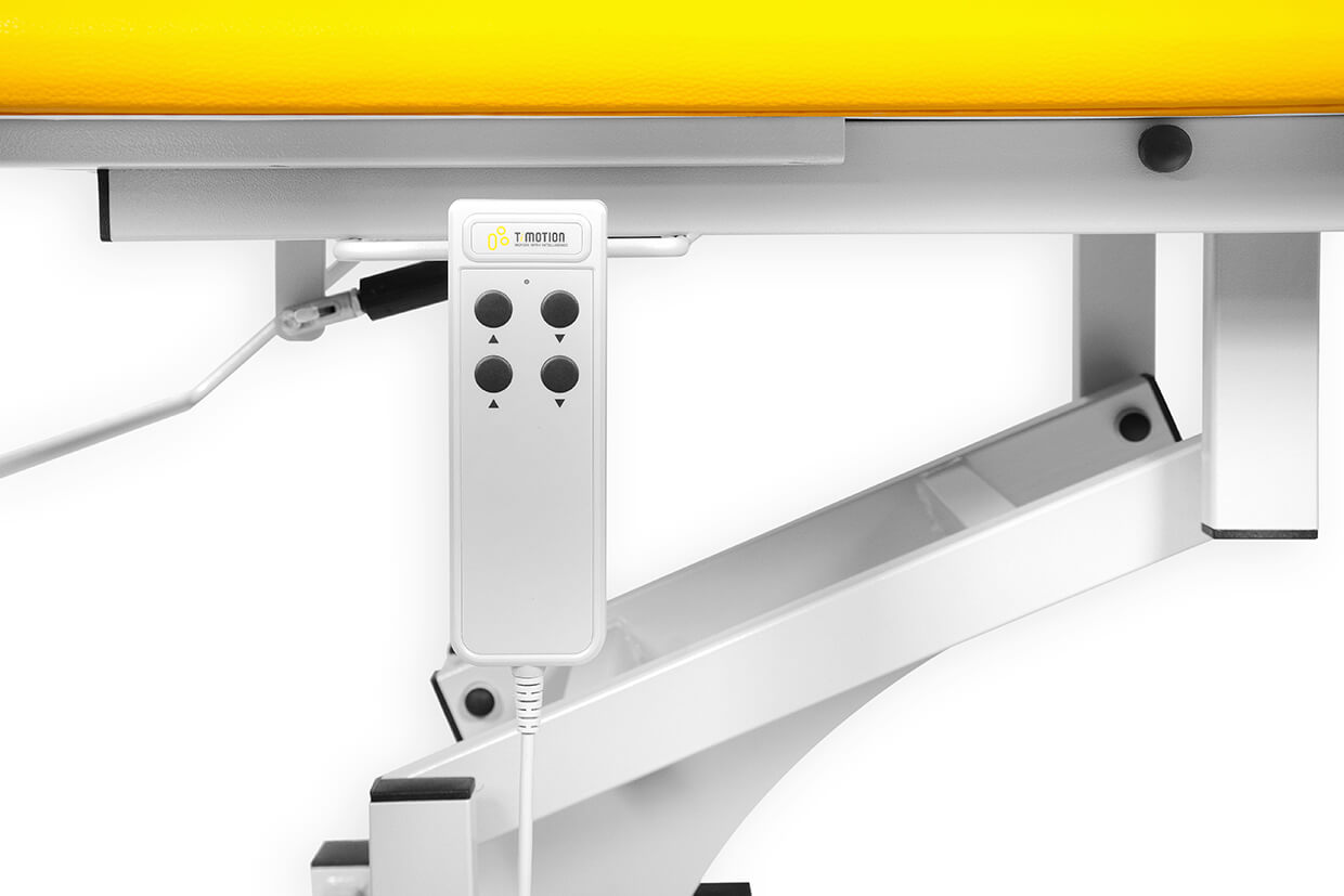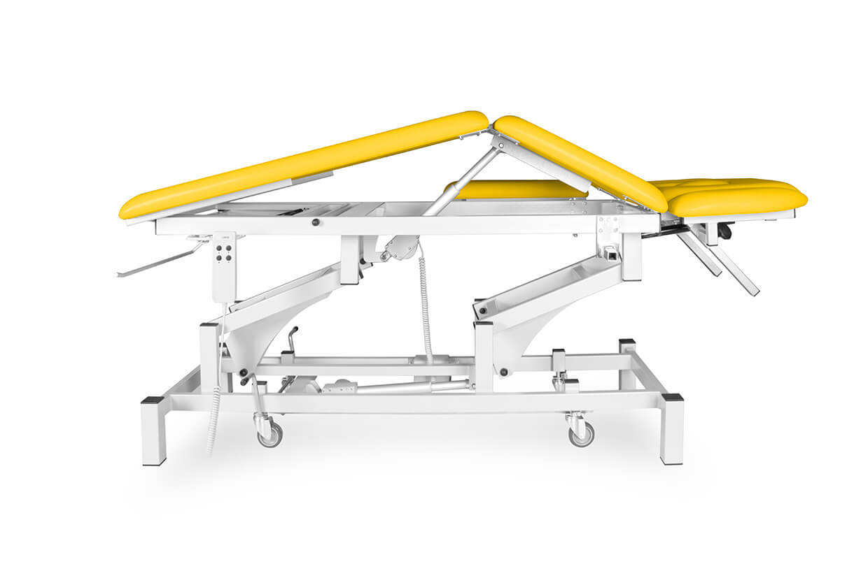 Pat profesional electric, reglabil, din trei elemente, cu un motor fiabil și silențios, potrivit pentru maseuri și fizioterapeuți cu o capacitate de încărcare de până la 200 kg și cu posibilitate de ridicare mai amplă. Patul este tapițat confortabil cu spumă de 4 cm grosime și imitație de piele de înaltă calitate, ușor de curățat și echipat cu piciorușe antiderapante reglabile. Partea superioară și cea inferioară (ridicare în V) ale patului pot fi pozițione cu ajutorul picioarelor telescopice. În prețul patului este inclusă și telecomanda.