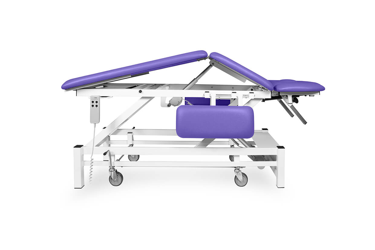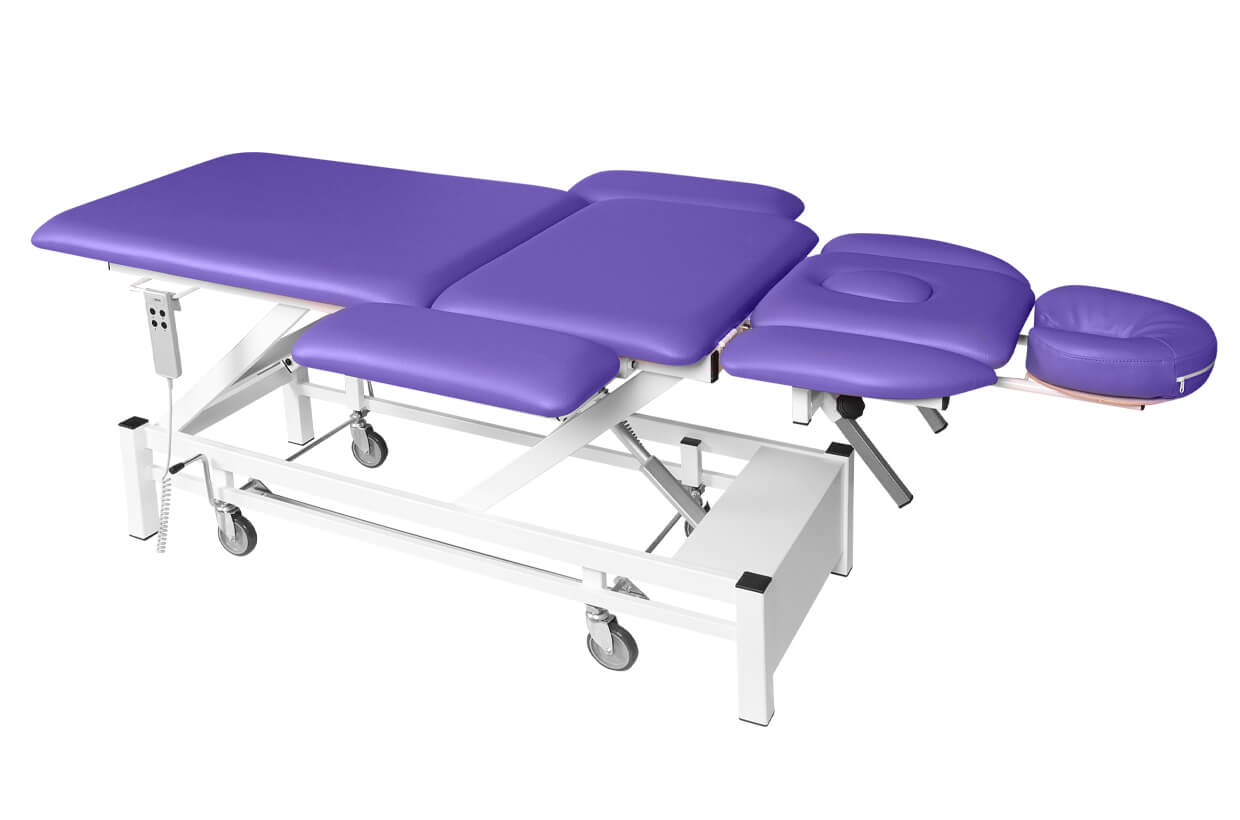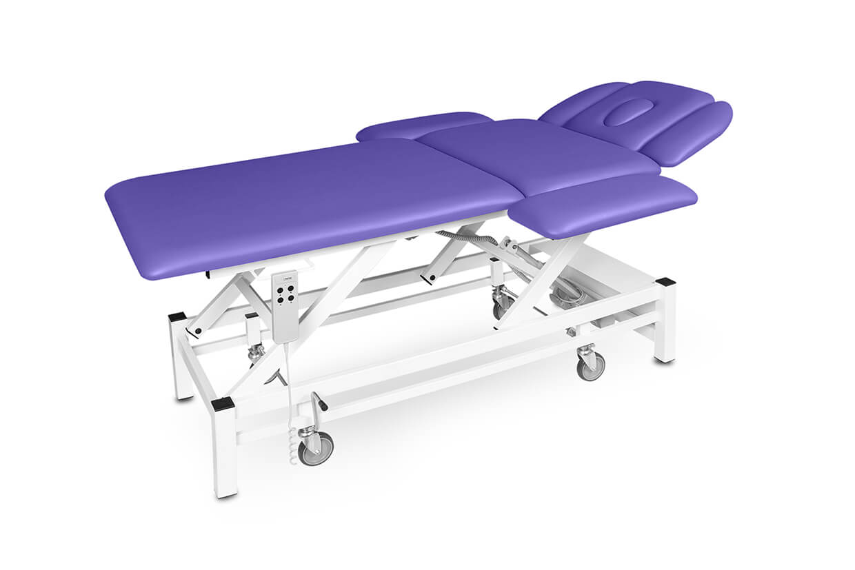 Pat profesional electric, reglabil, din trei elemente, cu un motor fiabil și silențios, potrivit pentru maseuri și fizioterapeuți. Patul este tapițat confortabil cu spumă de 4 cm grosime și imitație de piele de înaltă calitate, ușor de curățat și echipat cu piciorușe antiderapante reglabile. Partea superioară și cea inferioară (ridicare în V) ale patului pot fi poziționate cu ajutorul picioarelor telescopice. Prețul patului include telecomanda.