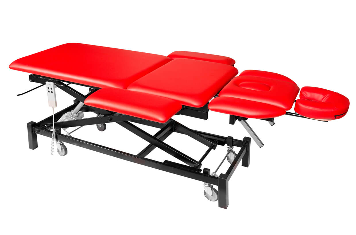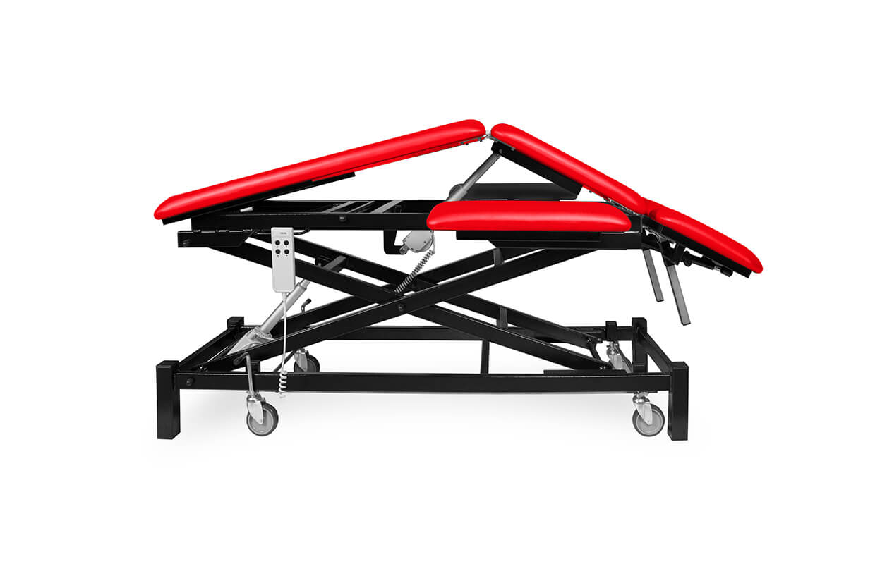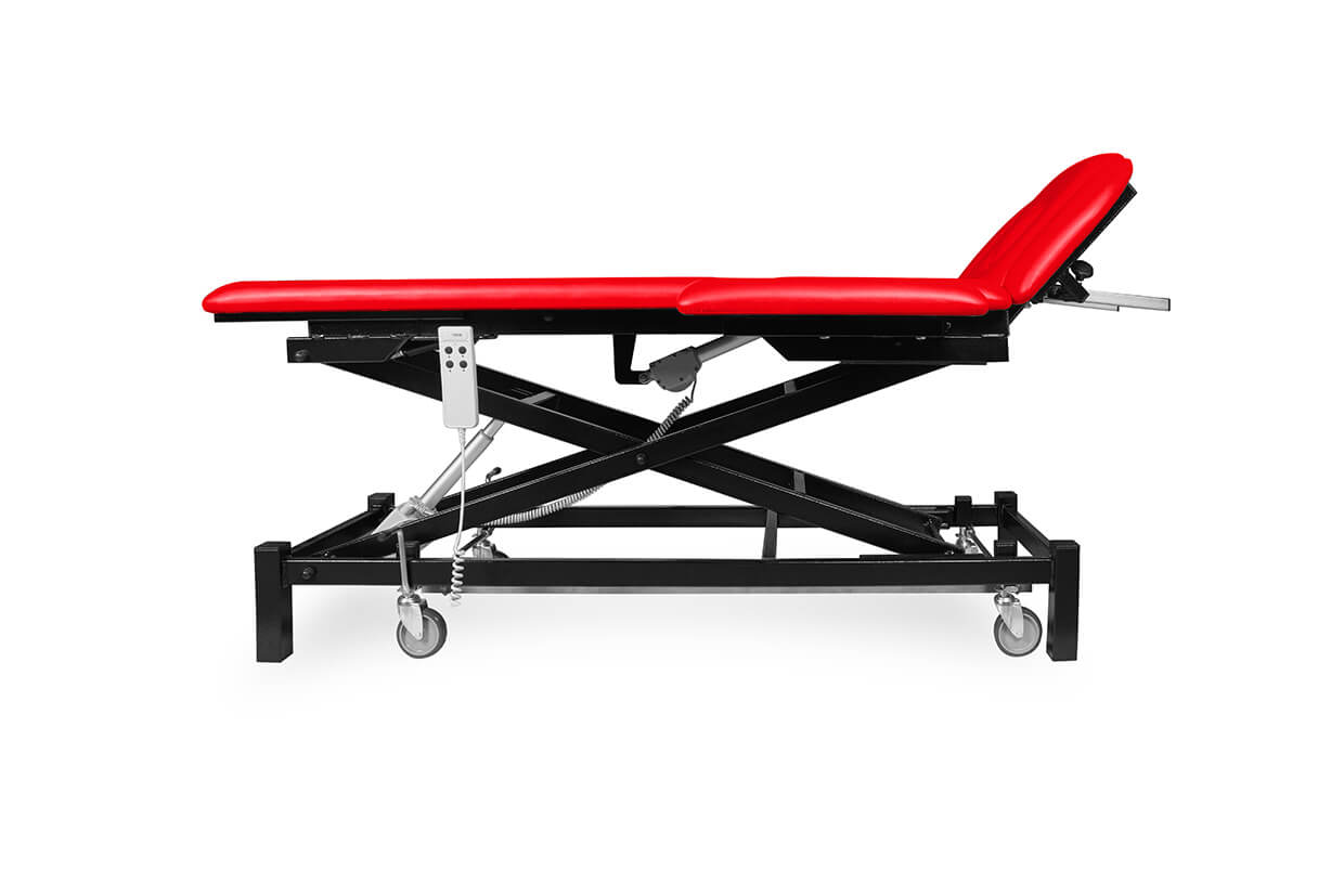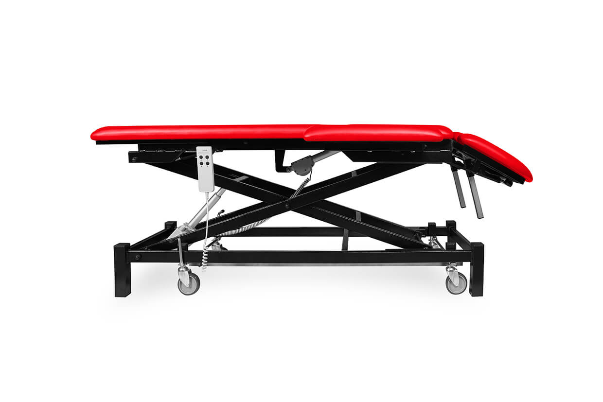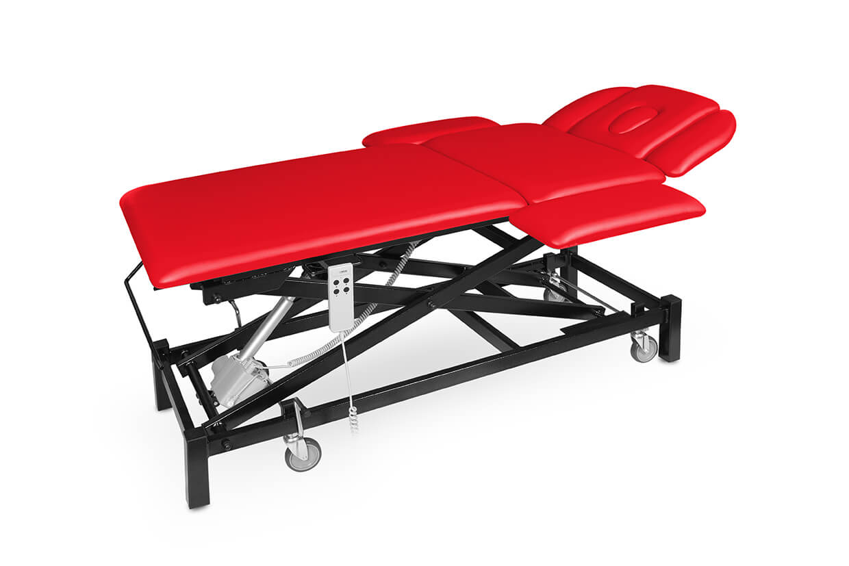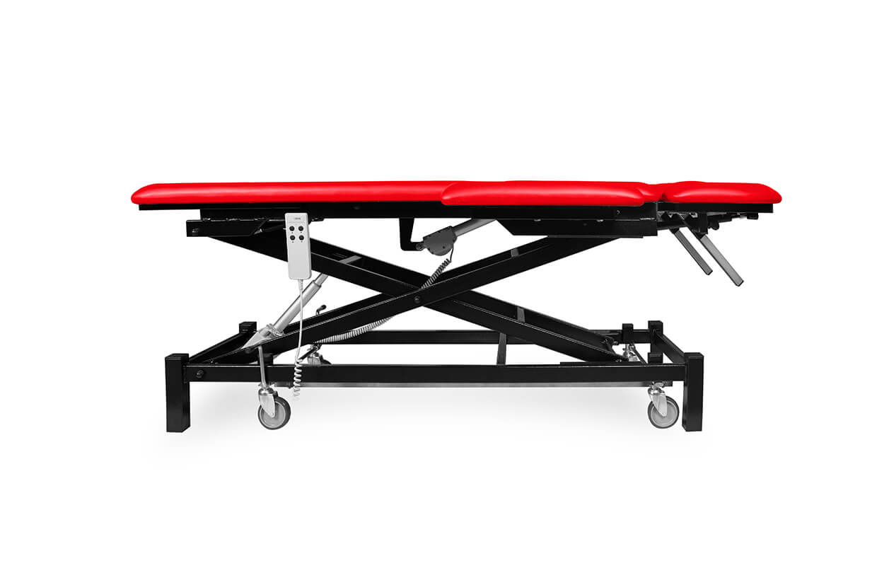 Pat profesional electric, reglabil, din trei elemente, cu un motor fiabil și silențios, cu un mecanism de ridicare tip foarfecă, care garantează mișcarea patului în sus și în jos fără deplasare laterală și o posibilitate de ridicare extra mare de până la 100 cm. Patul este tapițat confortabil cu spumă de 4 cm grosime și imitație de piele de înaltă calitate, ușor de curățat și echipat cu piciorușe antiderapante reglabile. Partea superioară și cea inferioară (ridicare în V) ale patului pot fi poziționate cu ajutorul picioarelor telescopice. În prețul patului este inclusă și telecomanda.