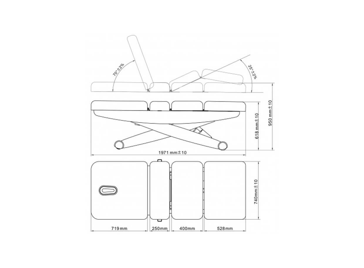 Confortul clientului este asigurat de lățimea patului 74 cm, reglarea înălțimii de la 61 până la 95 cm și 11 cm înălțimea saltelei tapițată cu piele PU rezistentă și plăcută la atingere de culoare albă. Suprafața este ușor de curățat.
