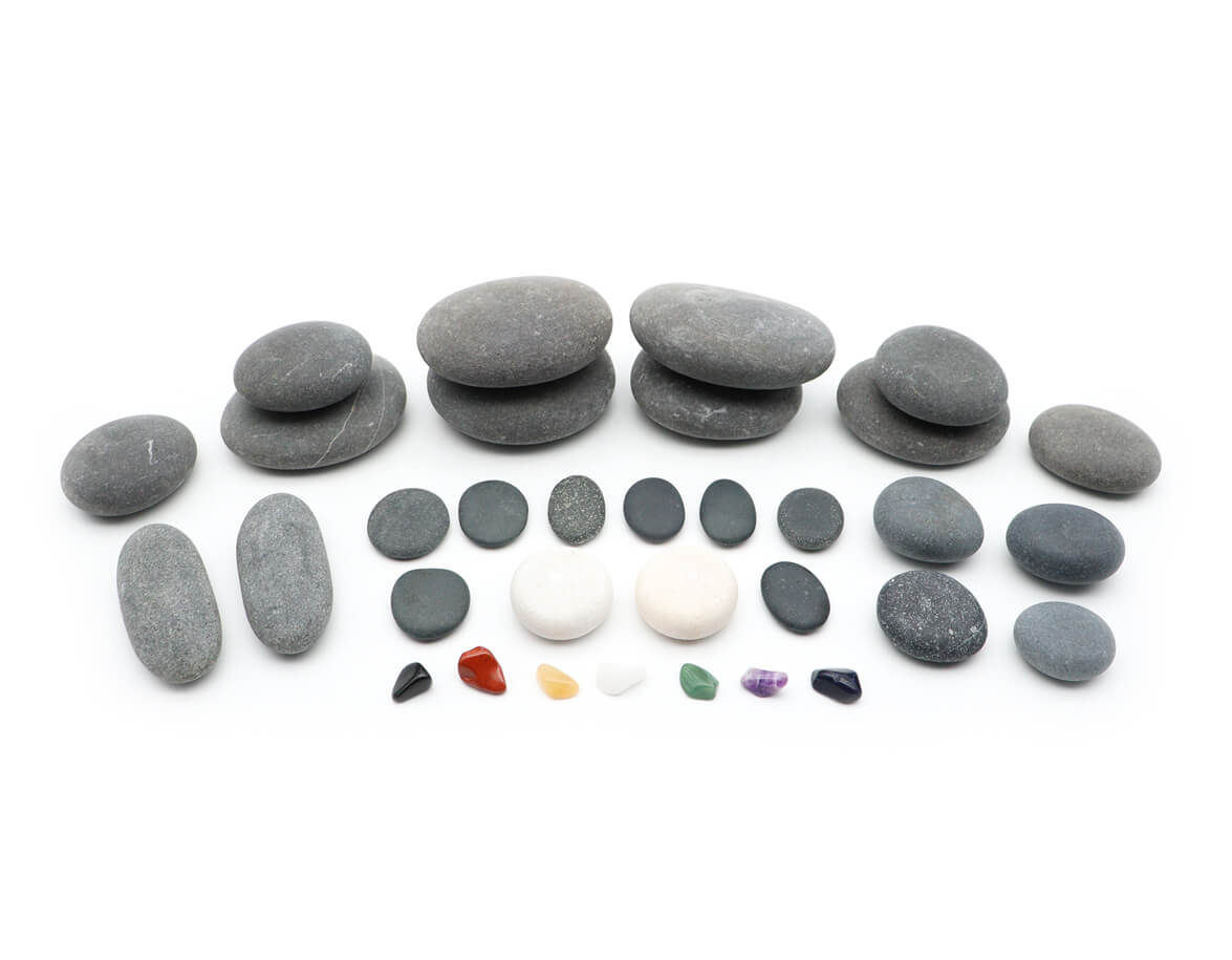 Un set complex de 33 de pietre bazaltice în formă naturală. Setul conține seturi de pietre de dimensiuni aproximativ egale în acdrul dimensiunilor individuale. Mai departe găsiți în set două pietre pentru masajul punctelor de declanșare (așa numitele trigger points), două pietre din amrmură și șapte pietre chakra din pietre semi-prețioase.