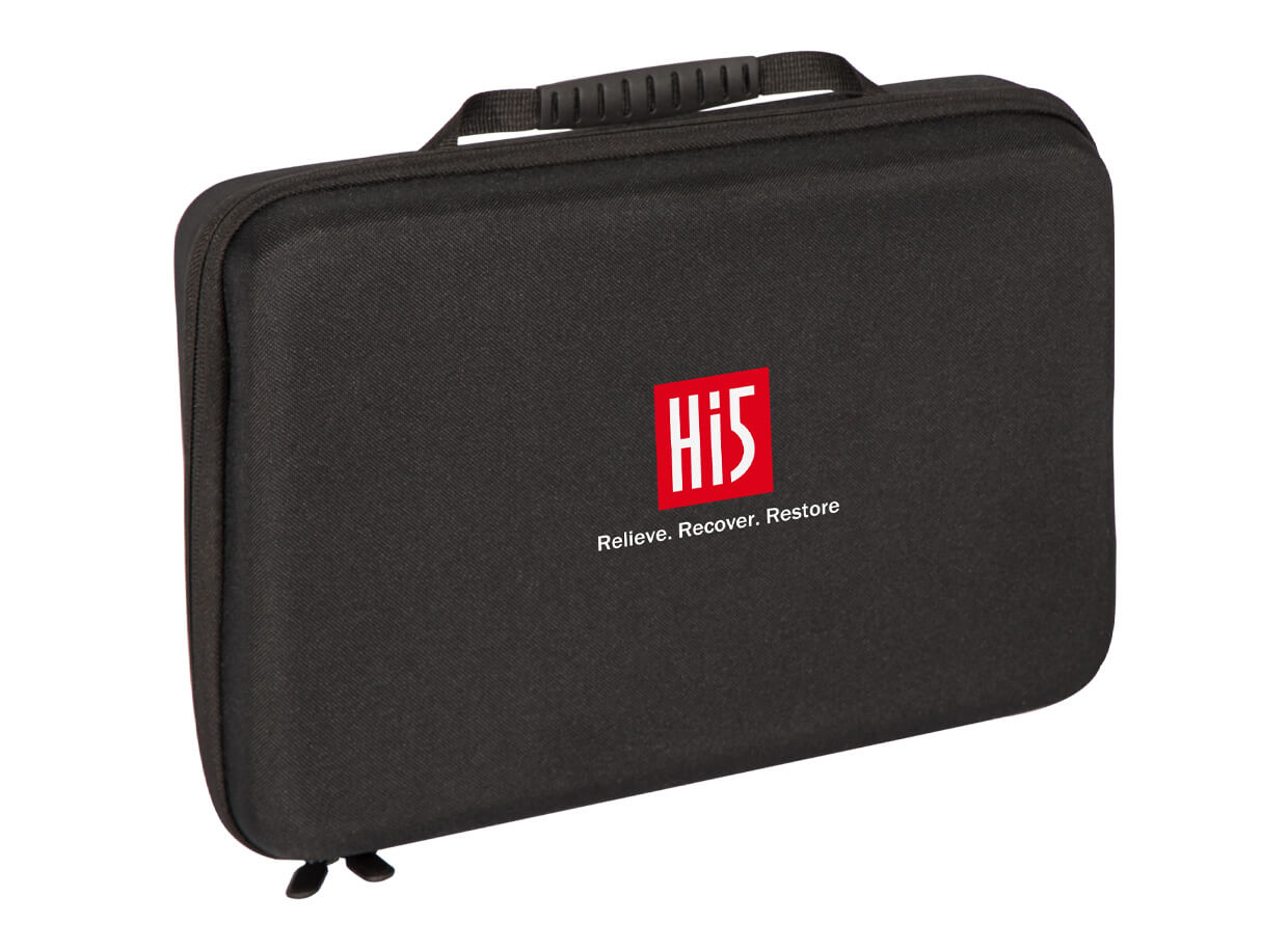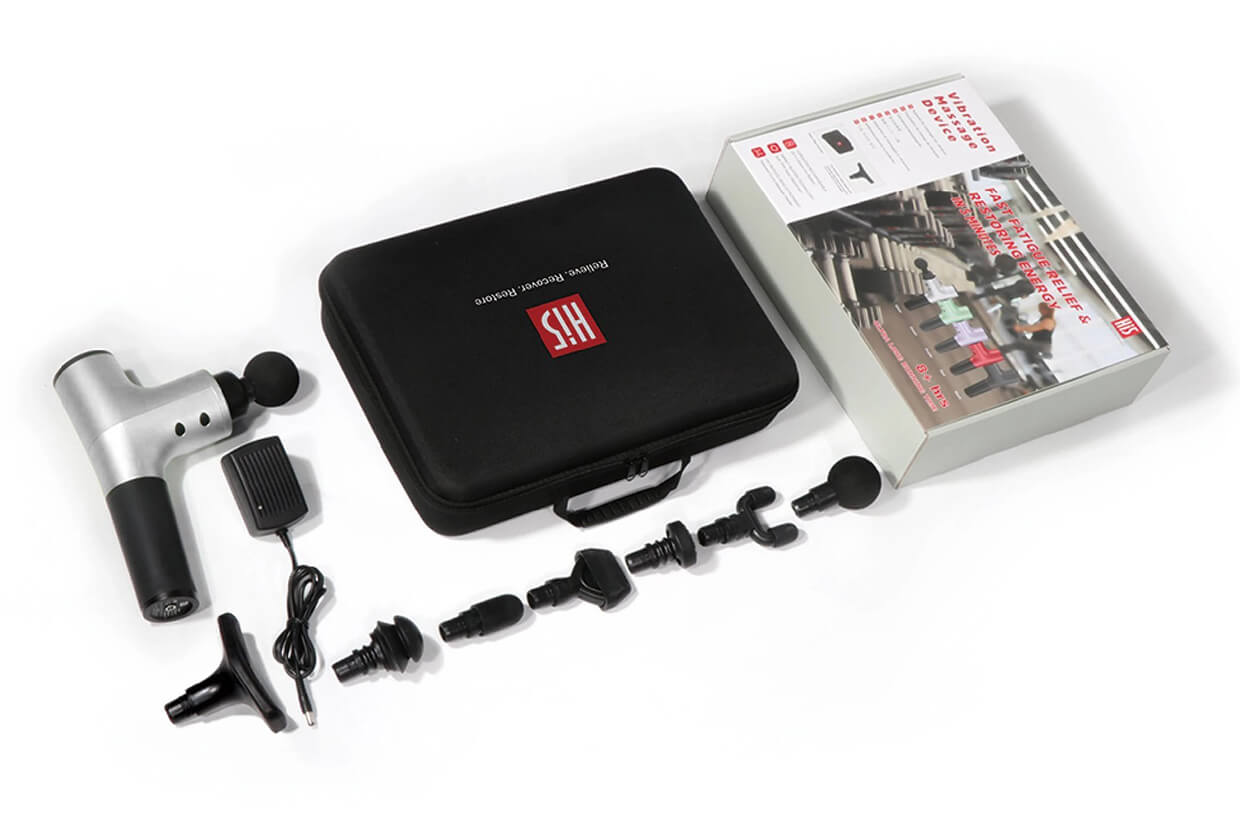 Pistolul vibrant este depozitat într-o husă din nylon împreună cu toate accesoriile. Fiecare cap de masaj, corpul pistolului cu baterie și încărcătorul își au locul specific în husă. Husa din nylon este practică, ușoară, dar rezistentă, ușor de curățat și protejează pistolul vibrant și accesoriile de praf, murdărie și deteriorare. Husa este echipată cu o curea - mâner, pentru transport ușor.