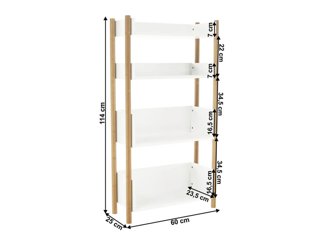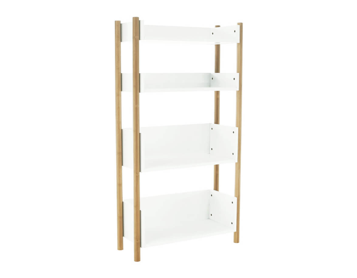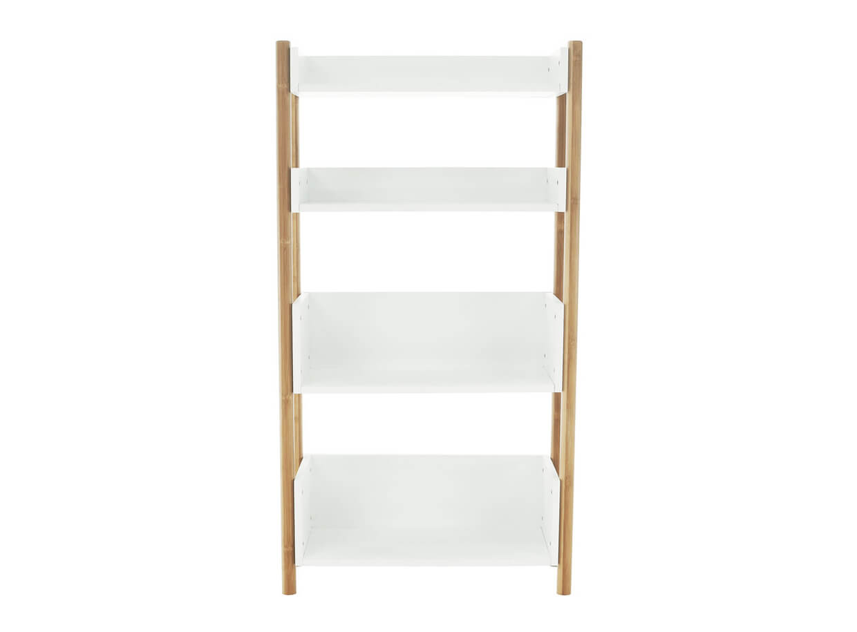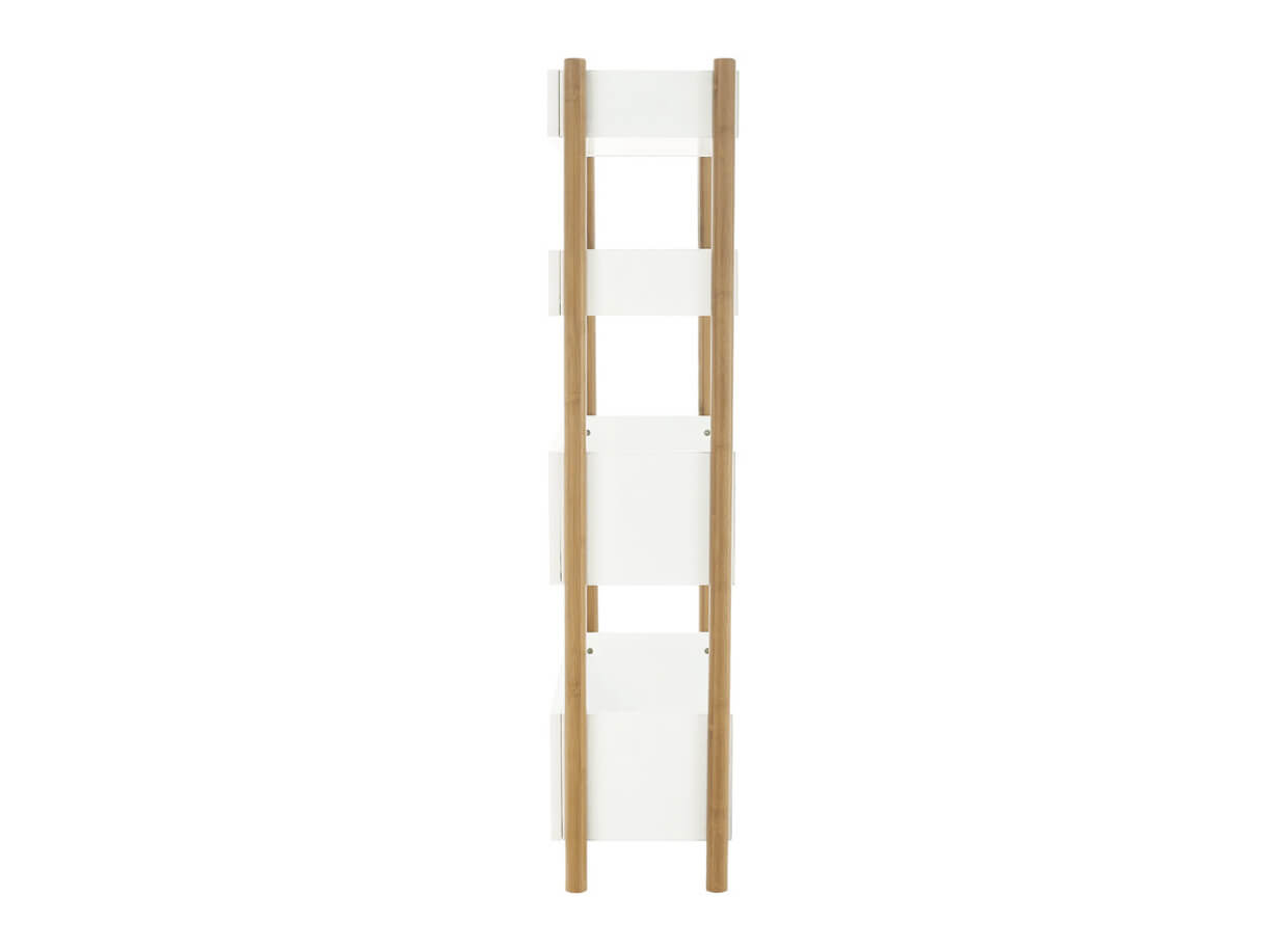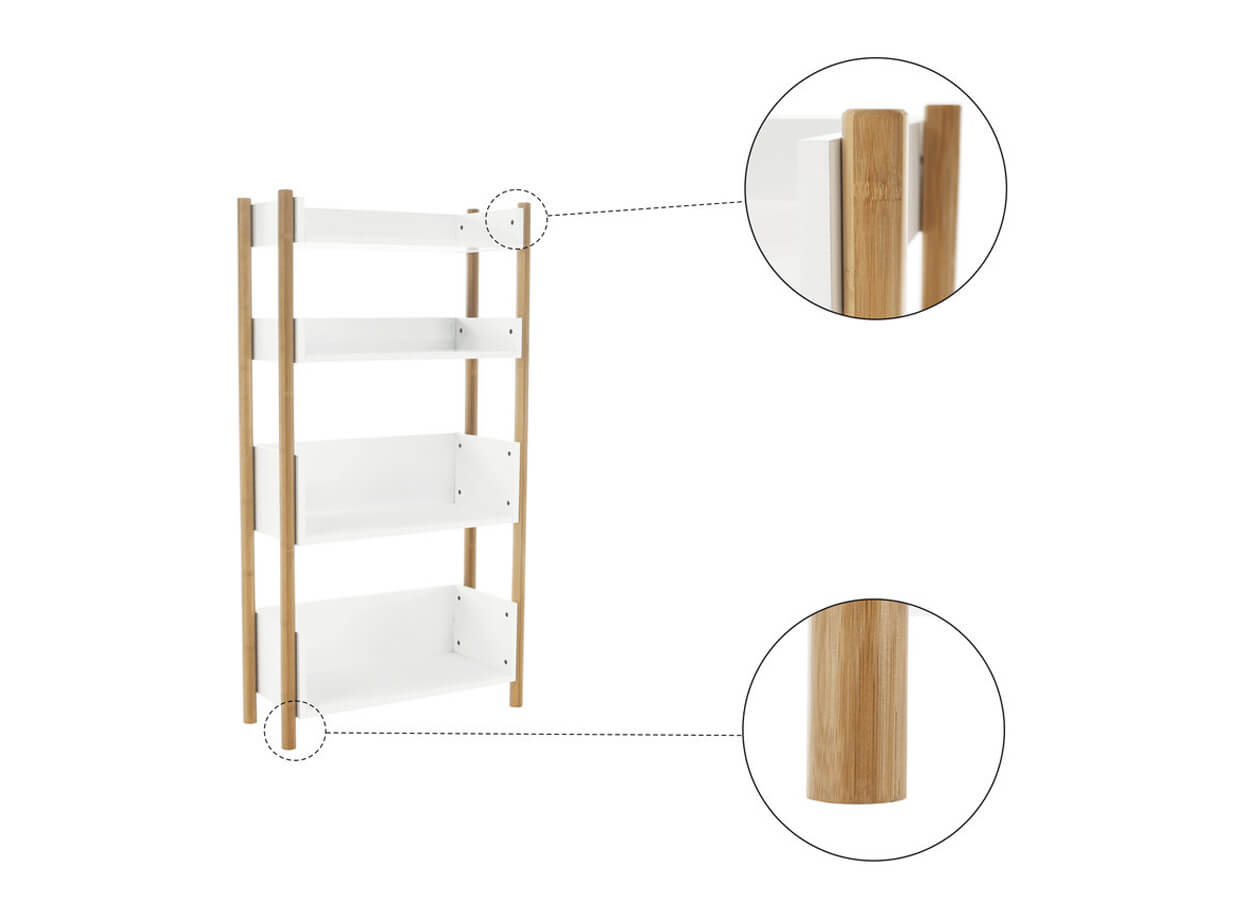 Construcția raftului este realizată din material solid, rezistent, bambus natural, de care sunt atașate patru polițe albe.