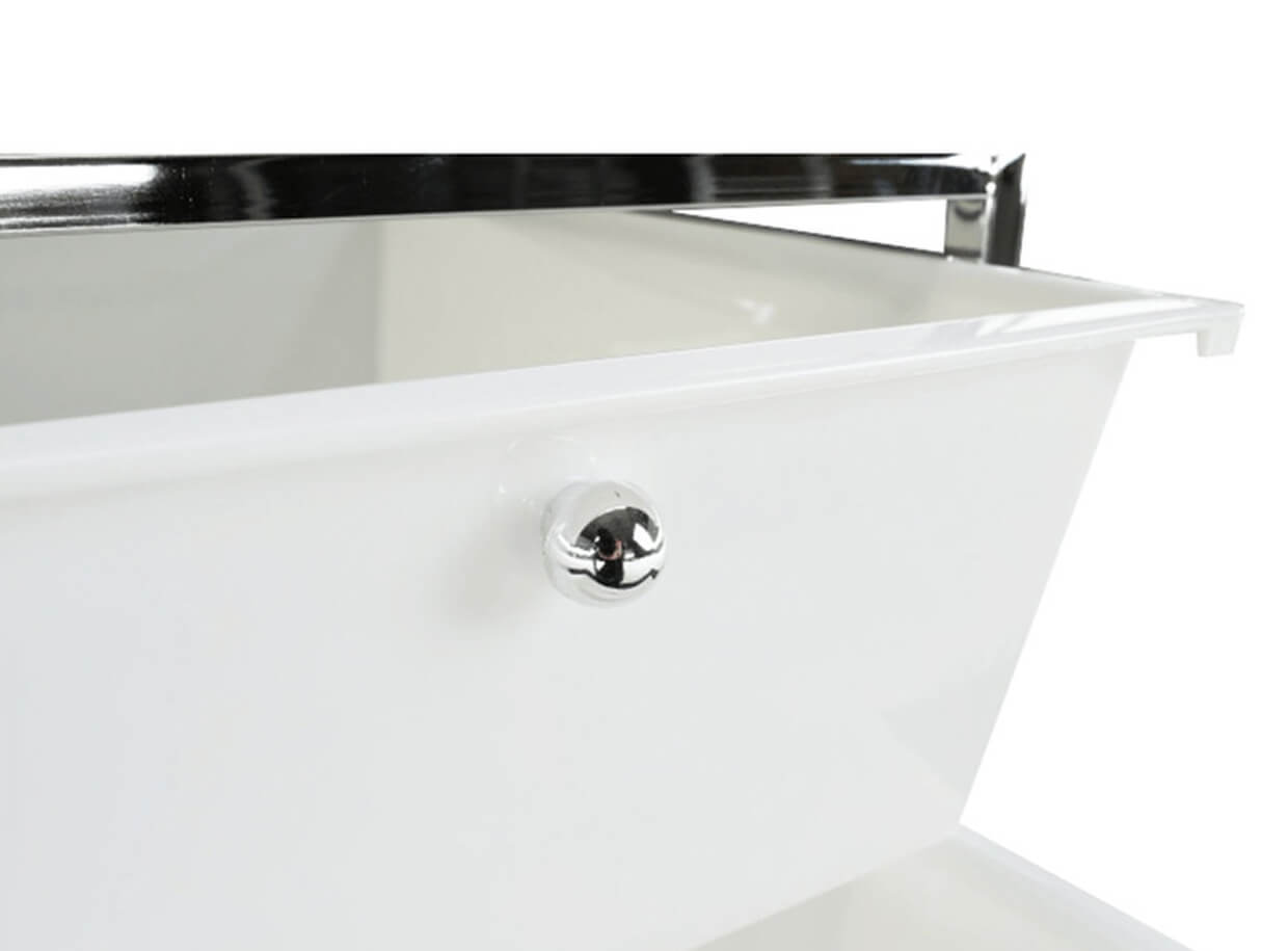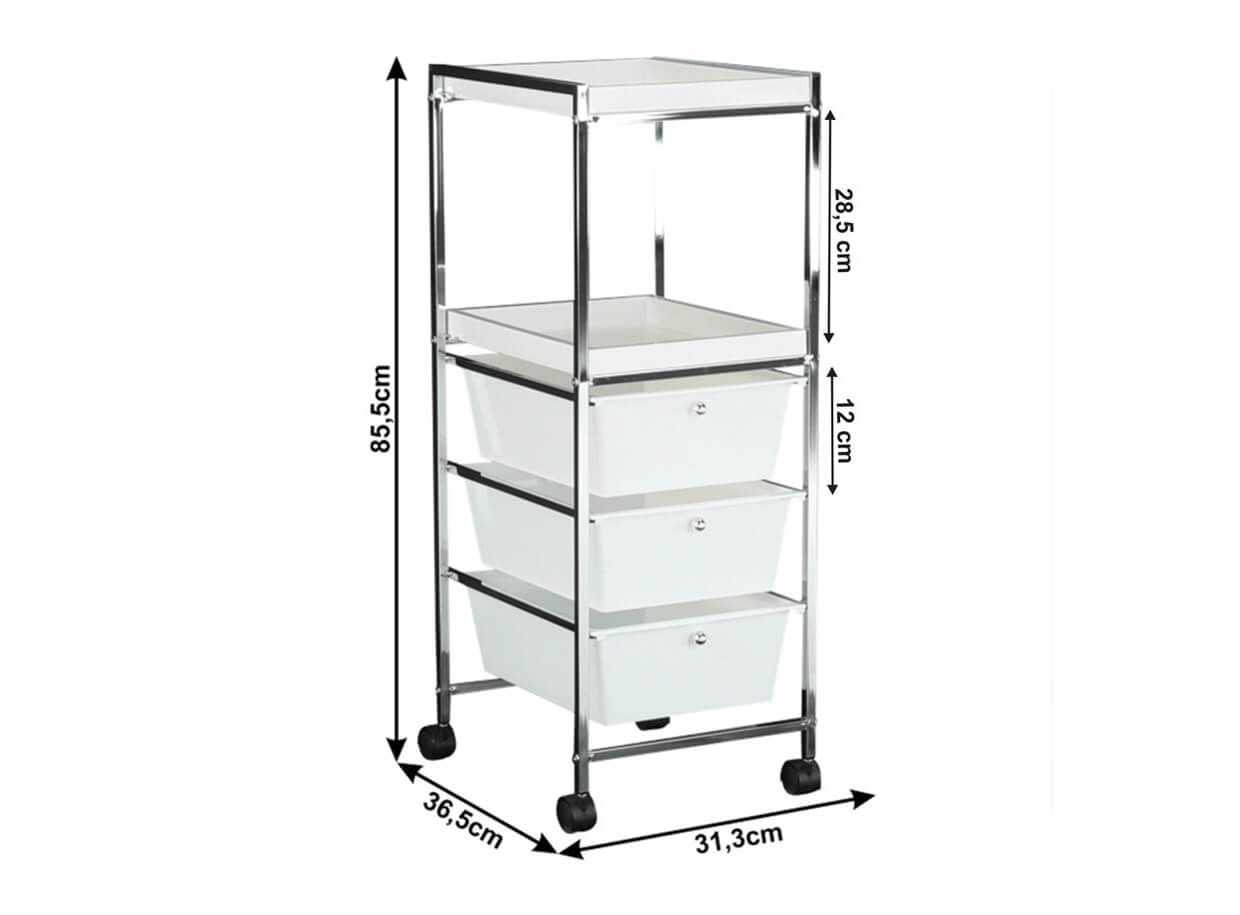 Raftul este realizat din plastic și crom și are o înălțime de 85,5 cm. Dispune de două polițe și trei sertare adânci, pentru depozitarea uleiurilor de masaj, a diferitelor accesorii pentru masaj, benzilor kinesiologice, cosmeticelor sau a prosoapelor.