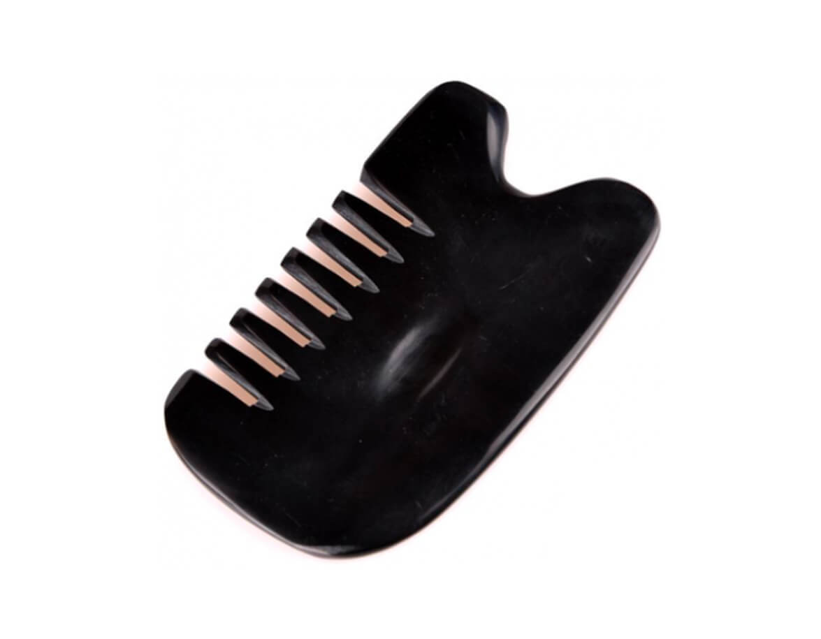 Guasha pieptene realizat manual din corn de bivol pentru masajul capului, feței și a corpului. Ajută la creșterea părului, susține circulația sângelui și sistemul limfatic.