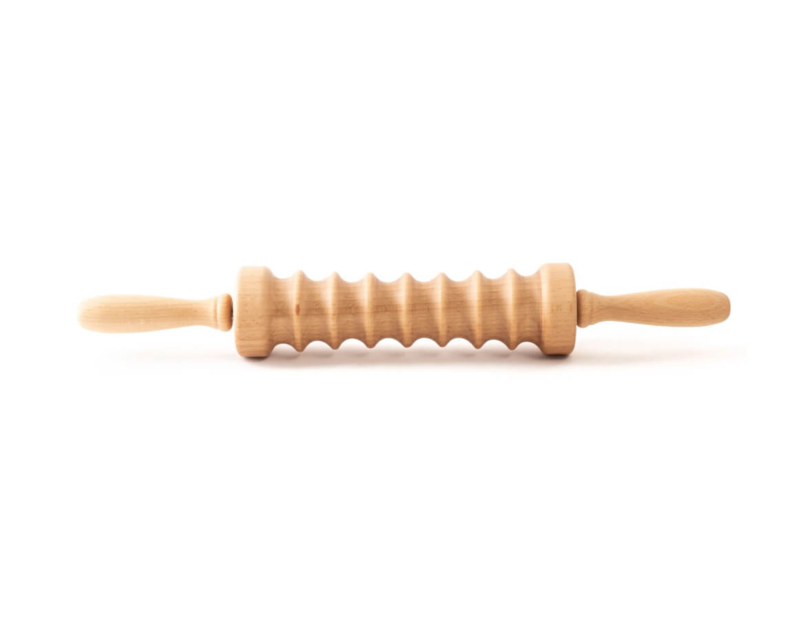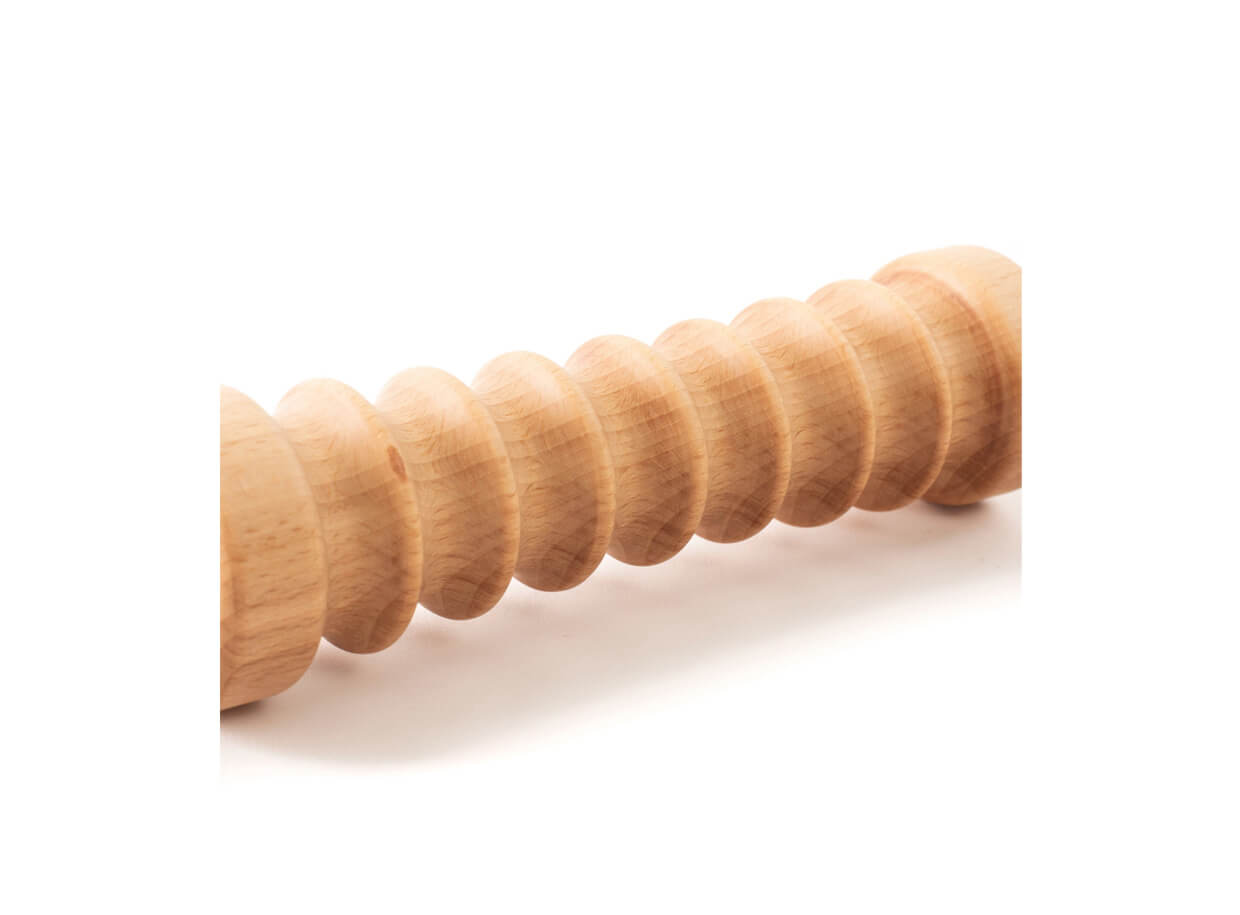Rolă de masajcu caneluri (proeminențe) pe suport din lemn de fag. Mânerele bine formate se potrives perfect în palme. Rola este potrivită pentru tratamentul prin masaj al părților problematice ale corpului cu apariția celulitei, pielea lăsată și un strat mai mare de grăsime subcutanată.