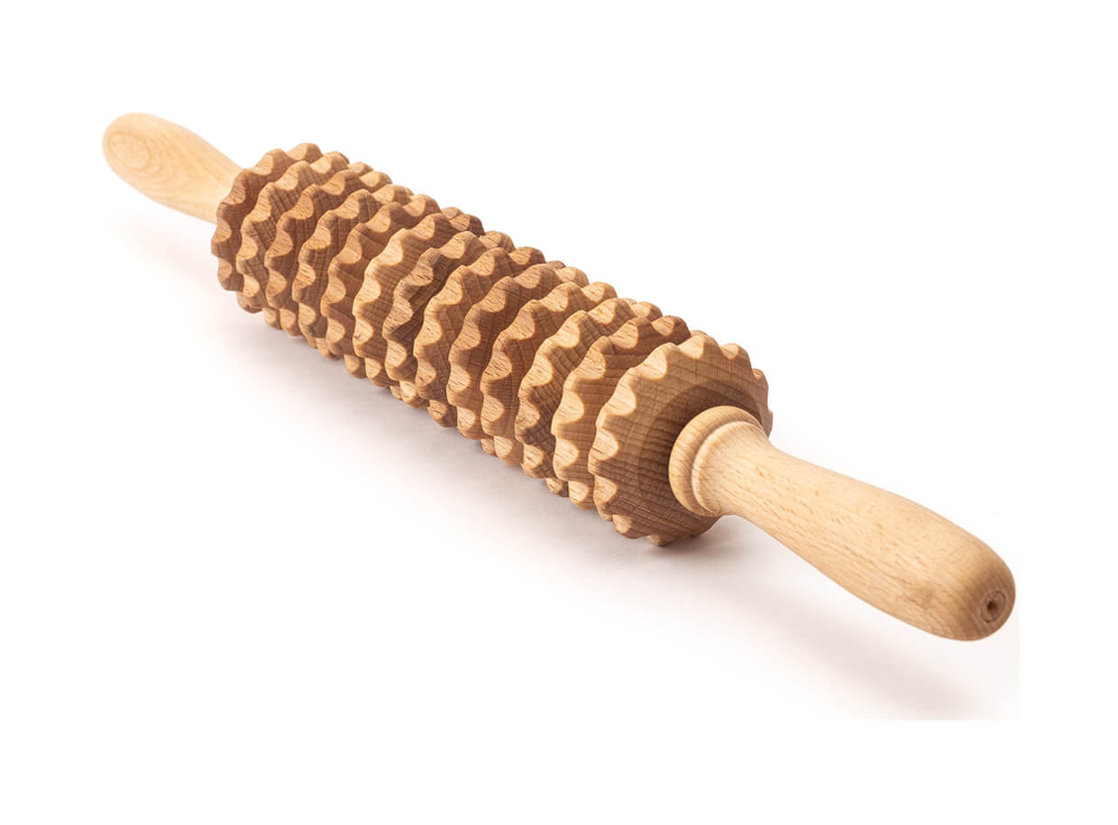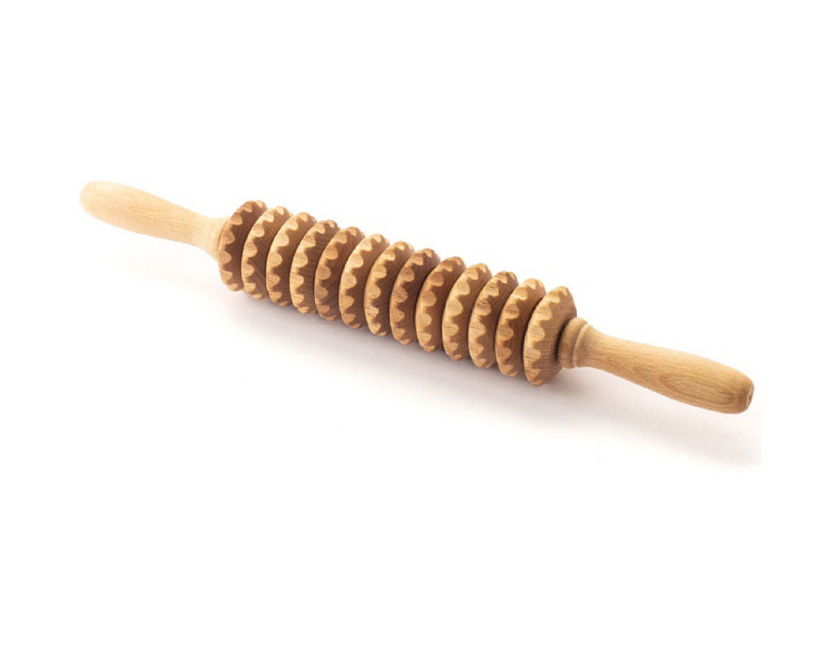 Rolă pentru masaj compusă din 13 discuri dințate din lemn de fag. Mânerele bine formate se potrivesc perfect în palme. Rola este potrivită pentru tratamentul prin masaj a unor zone mai mari de pe părțile problematice ale corpului cu celulită, un strat mai mare de grăsime subcutanată, sau piele lăsată.