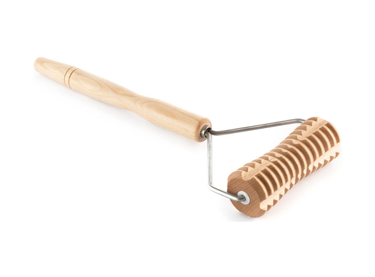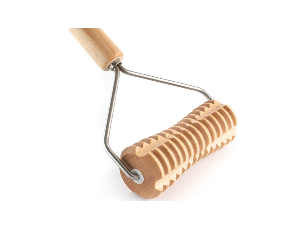 Rolă de masaj cu striații din lemn de fag, cu mâner, în formă de Y. Mânerul vă permite să dezvoltați o presiune adecvată în timpul masajului și să ajungeți confortabil chiar și la părțile mai puțin accesibile ale corpului în timpul auto-masajului.