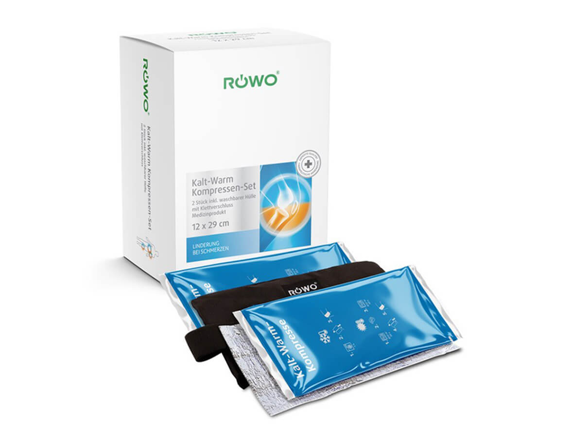 Umplutura specială cu gel este potrivită pentru încălzirea în cuptorul cu microunde. Pachetul conține 2 perne cu dimensiunea de 15x28 cm și un bandaj de fixare pentru o atașare ușoară la zona afectată. Datorită acoperirii inovative cu stratul ISOQUAT, se obține menținerea de până la 4 ori mai mult timp, a temperaturii necesare. Densitatea optimă a gelului și filmul poliuretanic cu trei straturi foarte adezivă, garantează modelarea ușoară a pernei RÖWO.
