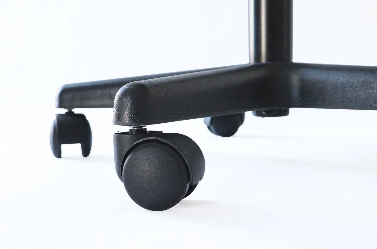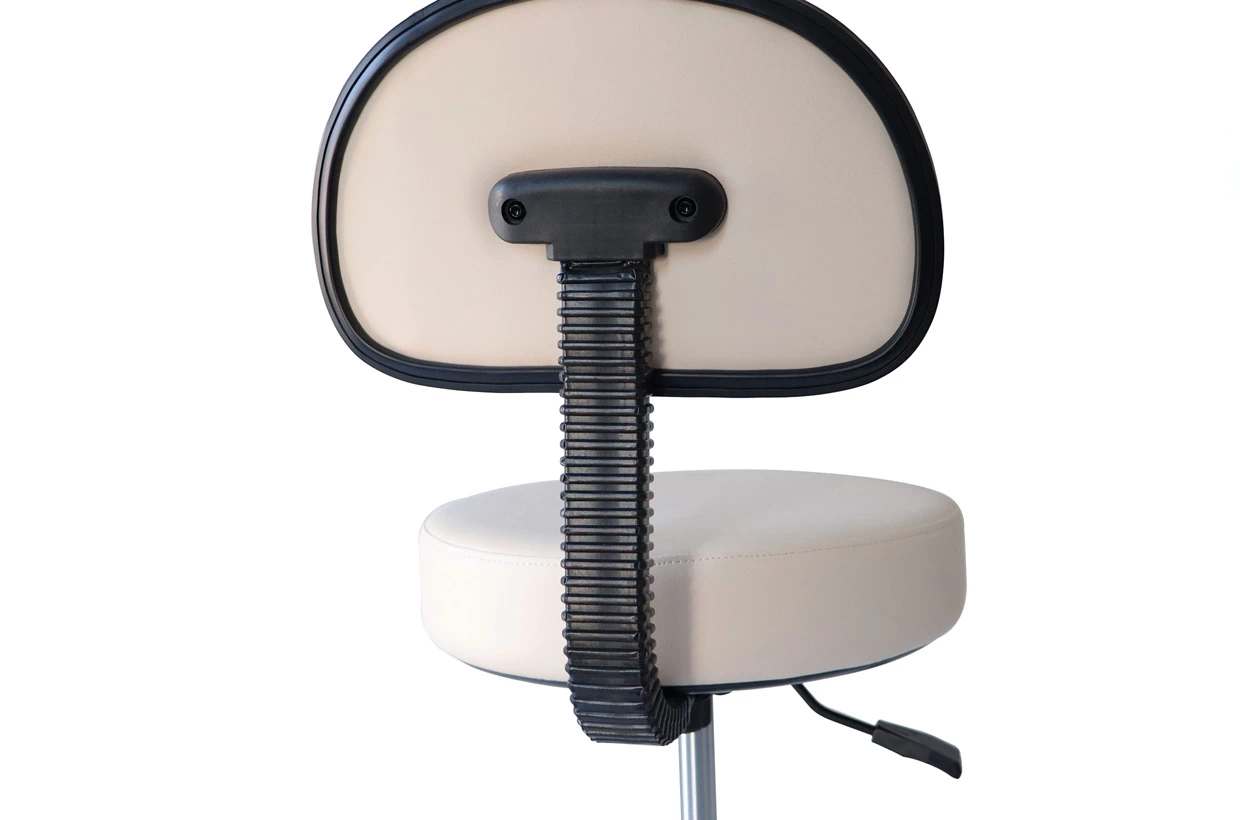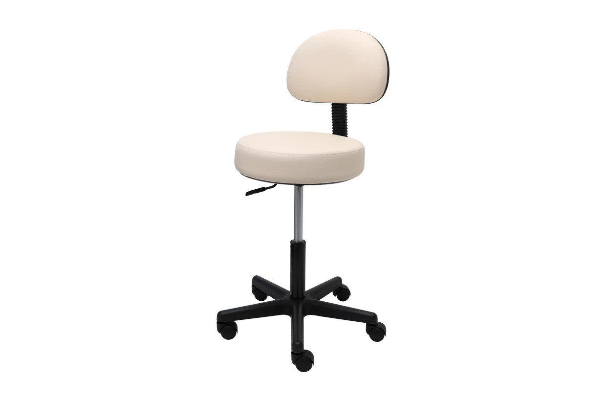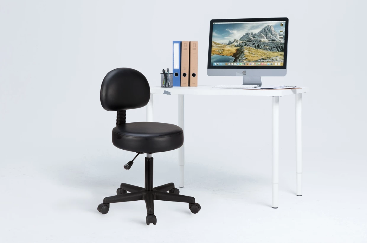 Scaun practic cu spătar, reglabil pe înălțime. 5 roți de plastic asigură o mișcare ușoară în spațiu. Scaunul este confortabil datorită tapițeriei șezutului, de 9 cm înălțime cu piele ecologică fină soft-touch și a spătarului, care susține coloana lombară.