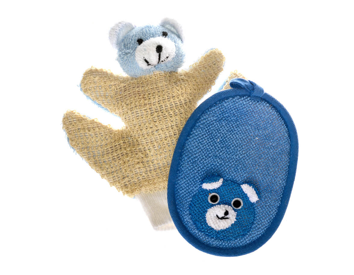 Mănușă și prosop cu model ursuleț, pentru spălarea întregului corp, potrivite în special pentru aplicarea peeling-ului corporal.