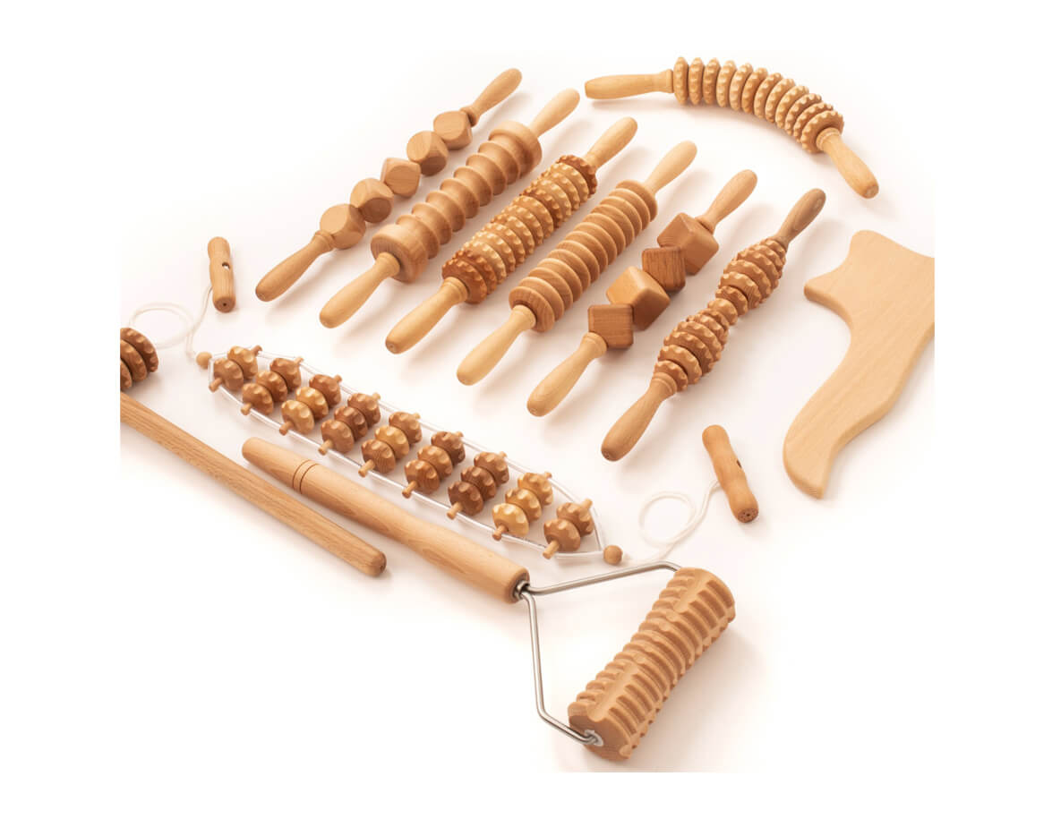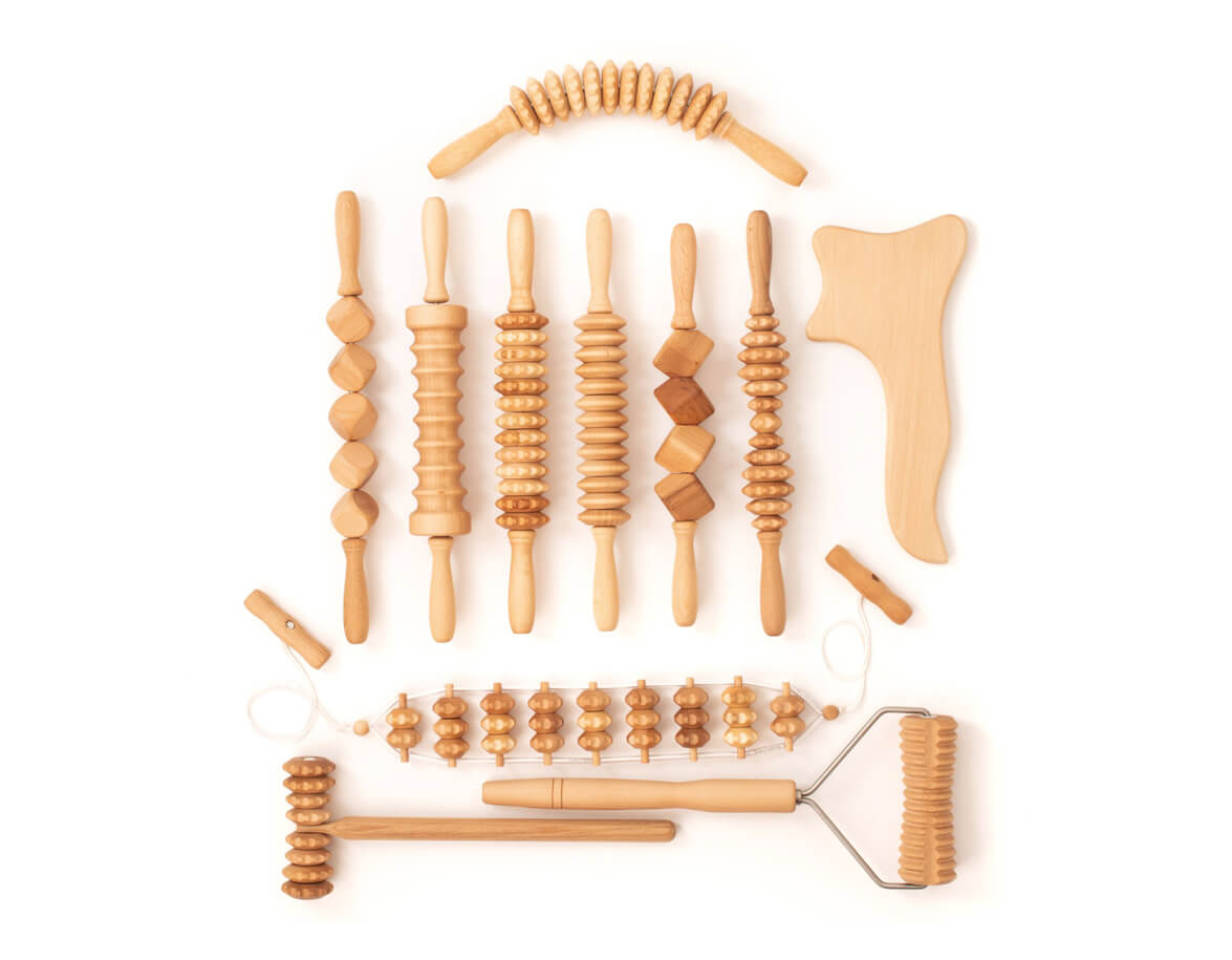În setul mare pentru maderoterapie găsiți 11 instrumente diferite din lemn de fag: