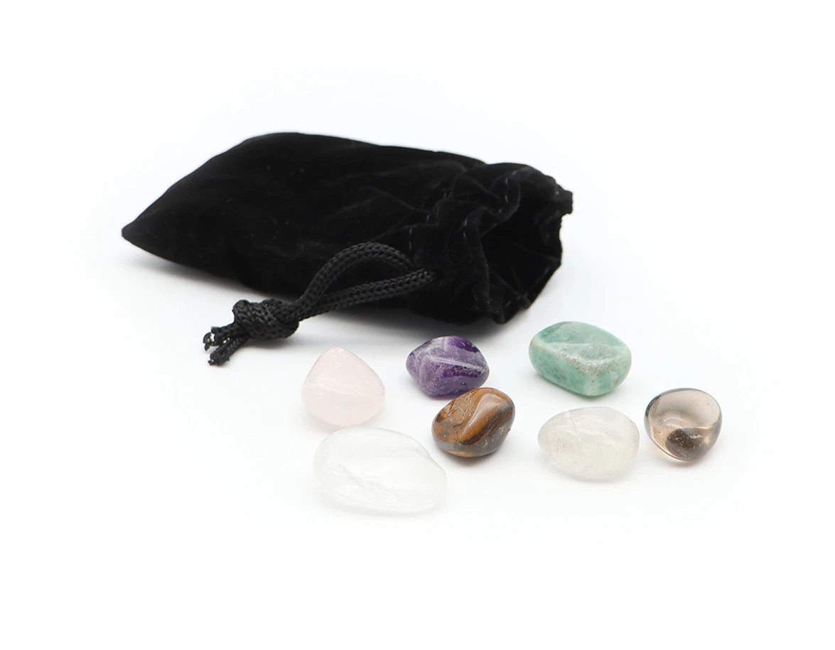 Într-un săculeț negru din catifea, care poate fi strâns cu ajutorul unui șnur, vei găsi 7 pietre chakra cu amplasarea recomandată (în timp ce clientul este culcat pe spate / sau pe burtă):