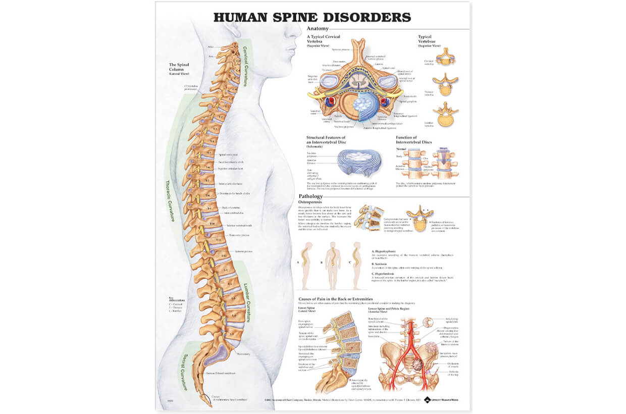 Schema prezintă o imagine laterală a unei coloane vertebrale sănătoase cu patru curburi fiziologice. Imaginile mai mici prezintă imaginea detaliată a vertebrei, a discului intervertebral și a funcției sale, precum și a unor boli și tulburări ale coloanei vertebrale (de exemplu, scolioză, hiperlordoză) ca fiind cauzele durerii de spate.