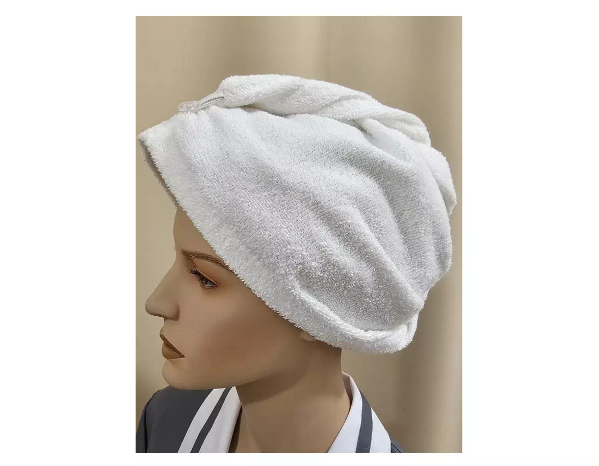 Prosop pentru păr, cusut în formă practică de turban, cu nasture. Cu dimensiunile de 70 x 25 cm acesta este suficient de încăpător și pentru părul lung.