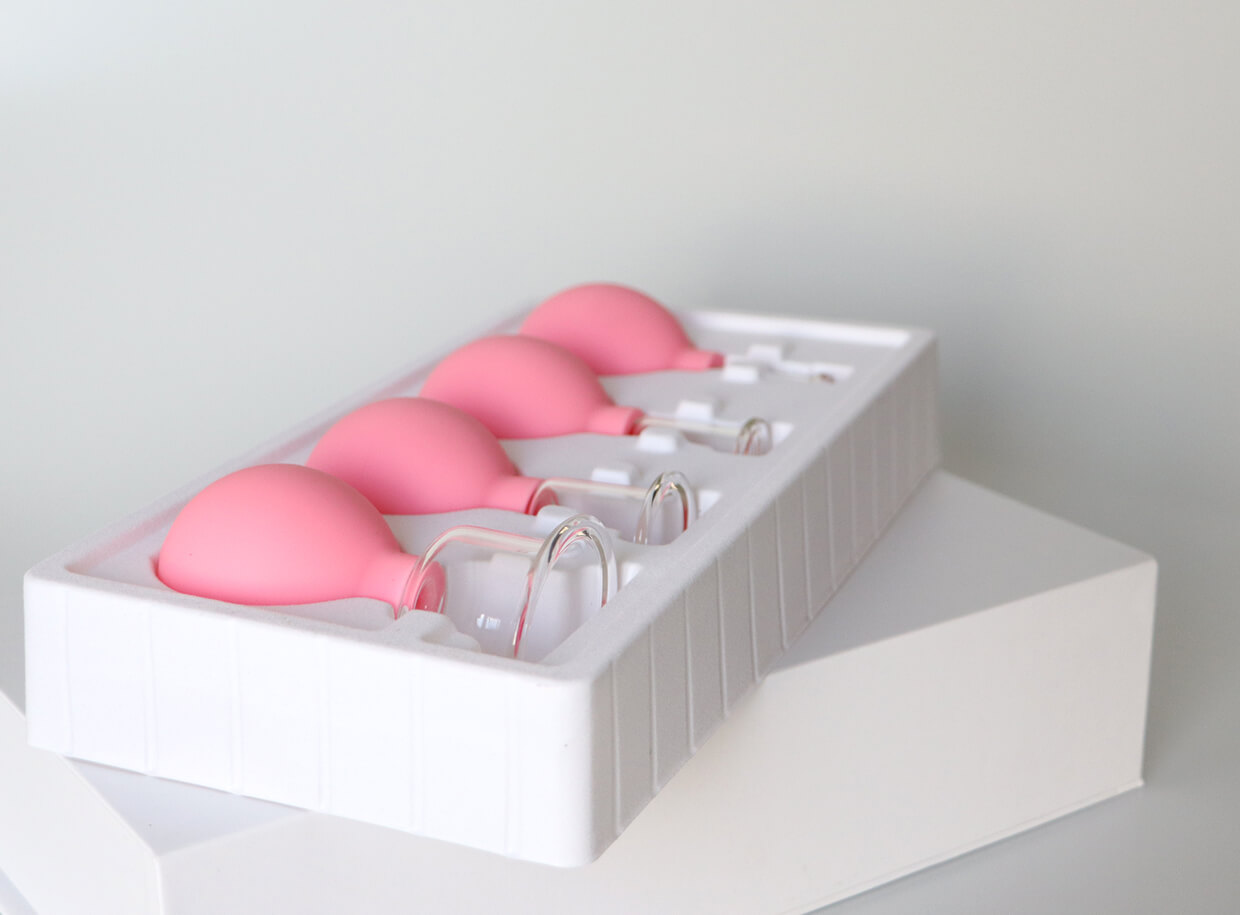Setul conține patru ventuze de sticlă, de diferite dimensiuni, cu balonașe de cauciuc, sunt potrivite pentru față și diferite părți ale corpului. Nu este nevoie să încălziți ventuzele înainte de procedură, ceea ce facilitează semnificativ munca maseurului. Ajunge să strângeți balonașul și să aplicați ventuza pe piele.