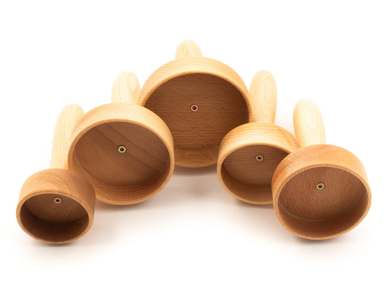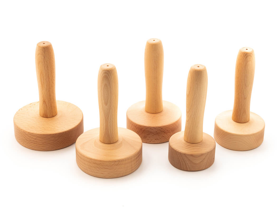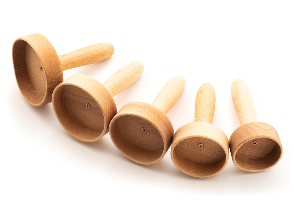 Set mare de 5 ventuze din lemn pentru maderoterapie cu diametru de 7, 8, 9, 10 și 11 cm. Mânerele suficient de lungi permit o bună manevrare a ventuzelor.