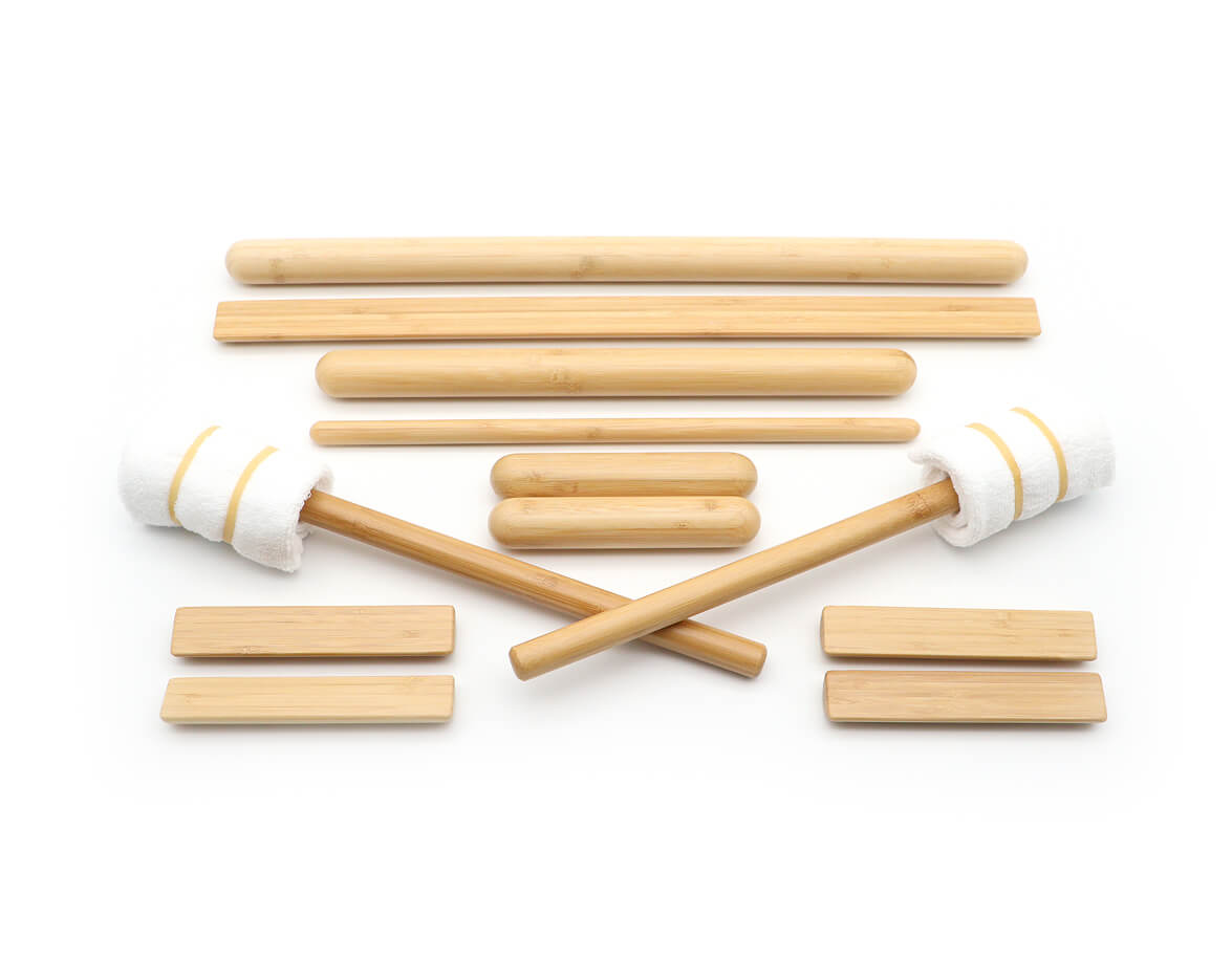 Setul de 12 bețe de bambus naturale presate la rece, destinate masajului întregului corp.